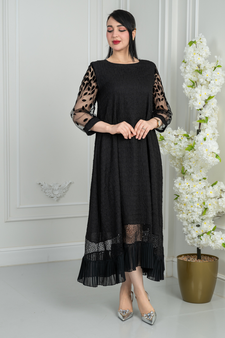 جلابية بتصميم واسع وقصة مريحة، تأتي بلون أسود مع تفاصيل شفافة على الأكمام وأسفل القطعة تضيف لمسة عصرية راقية، مناسبة للمناسبات والزيارات.