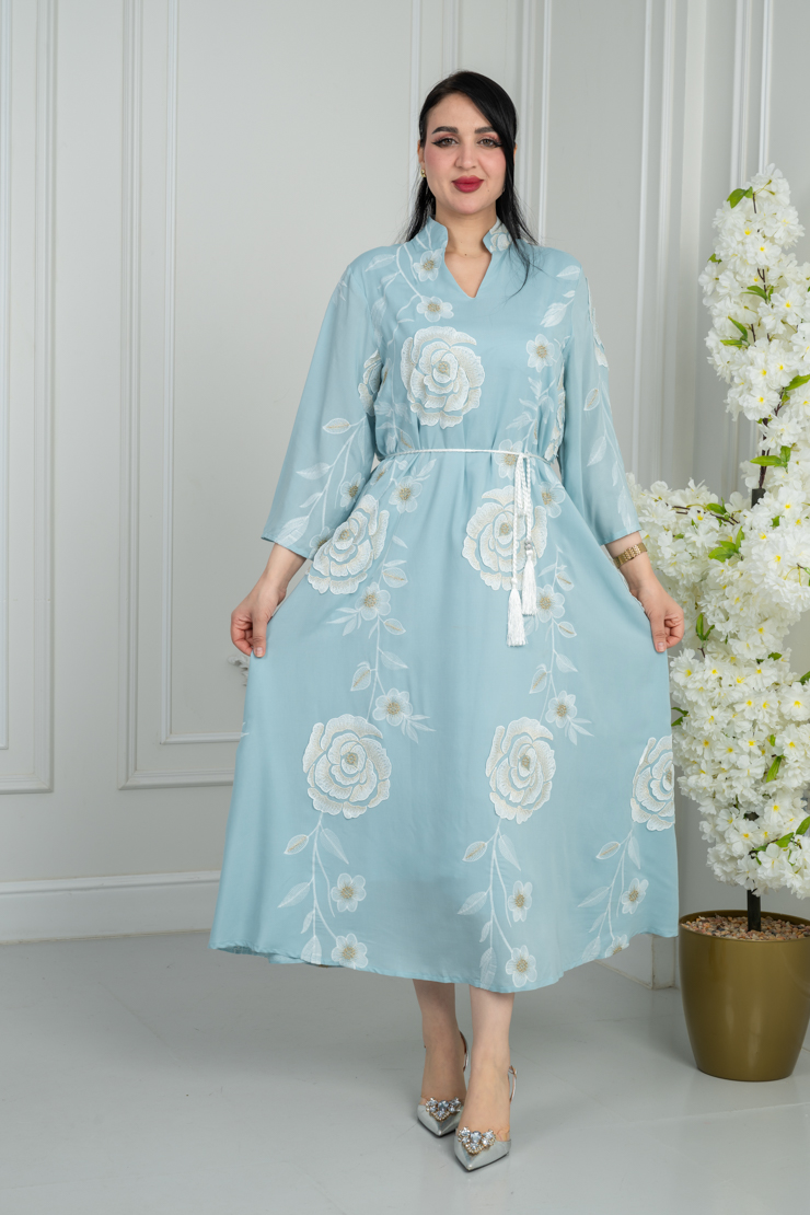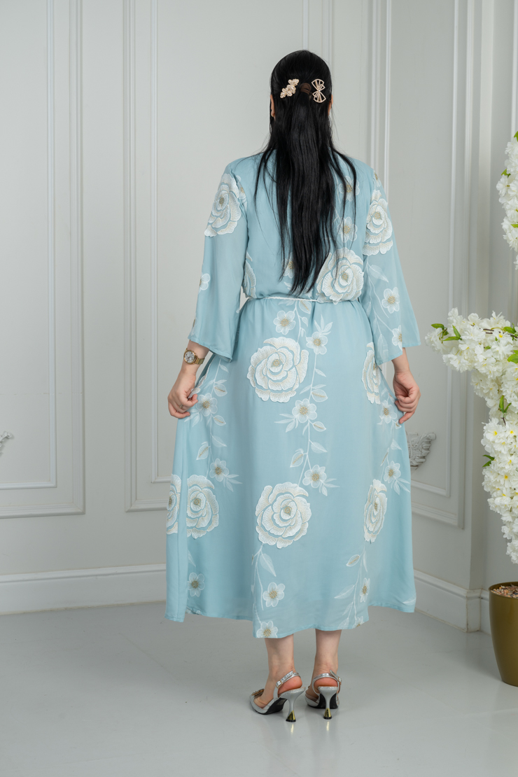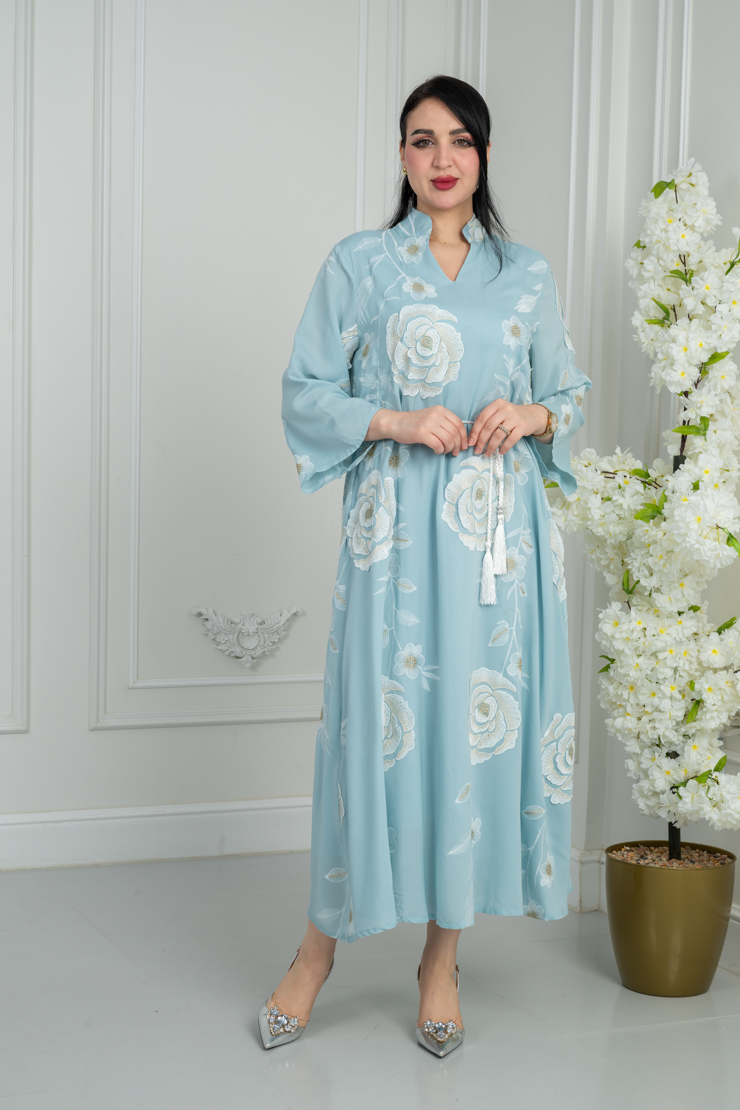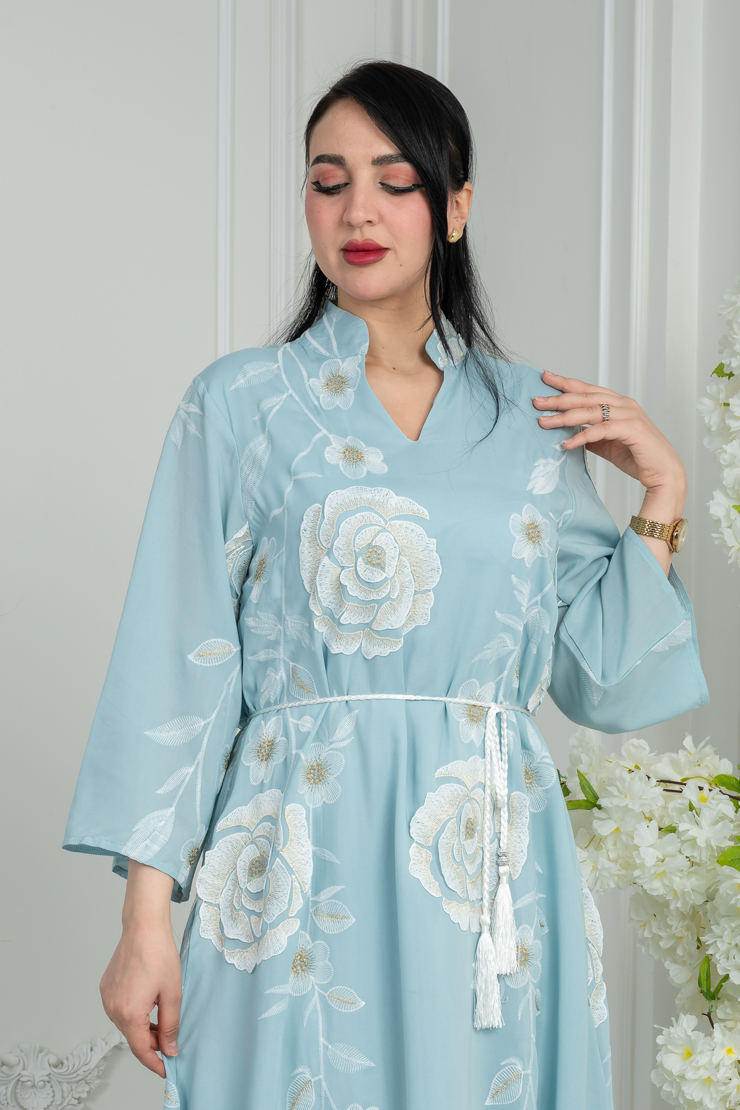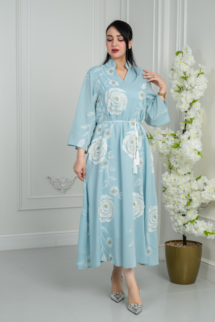 جلابية بلون أزرق سماوي مع نقشة ناعمة لإطلالة هادئة ومريحة.
