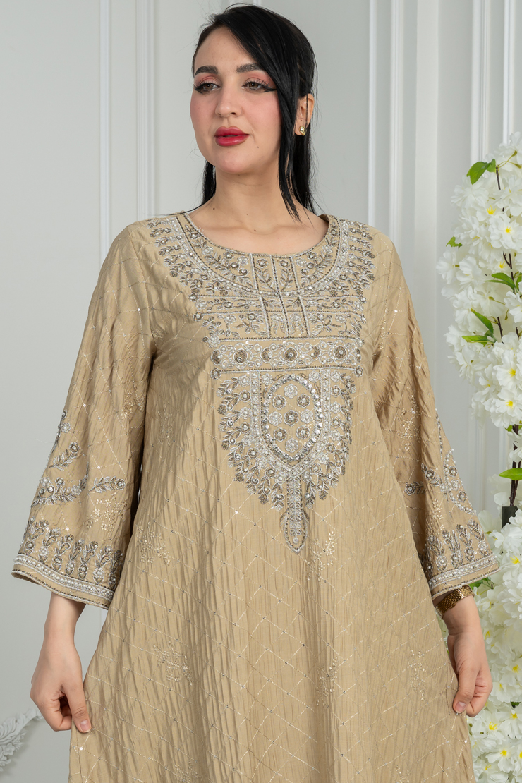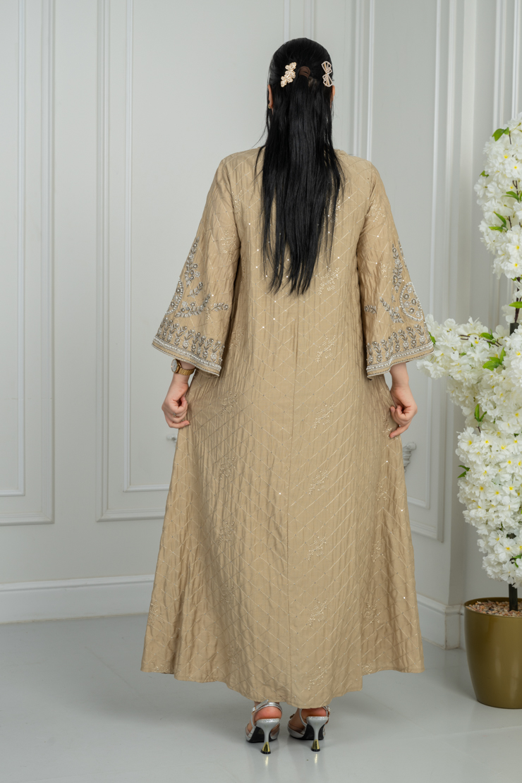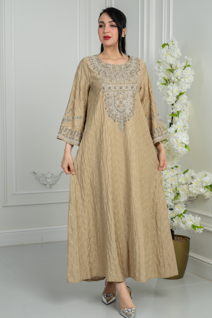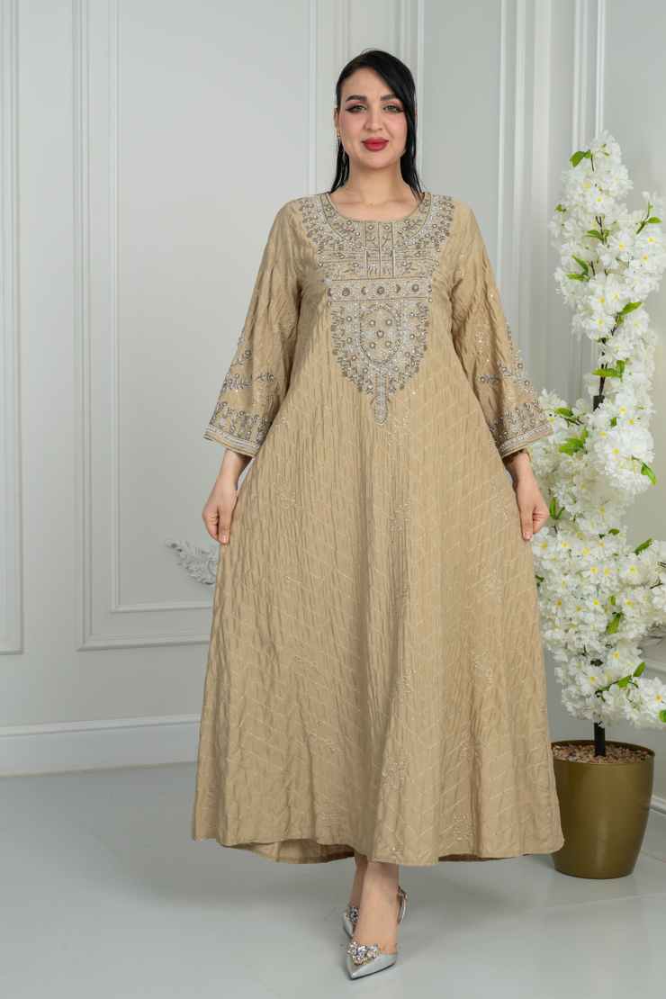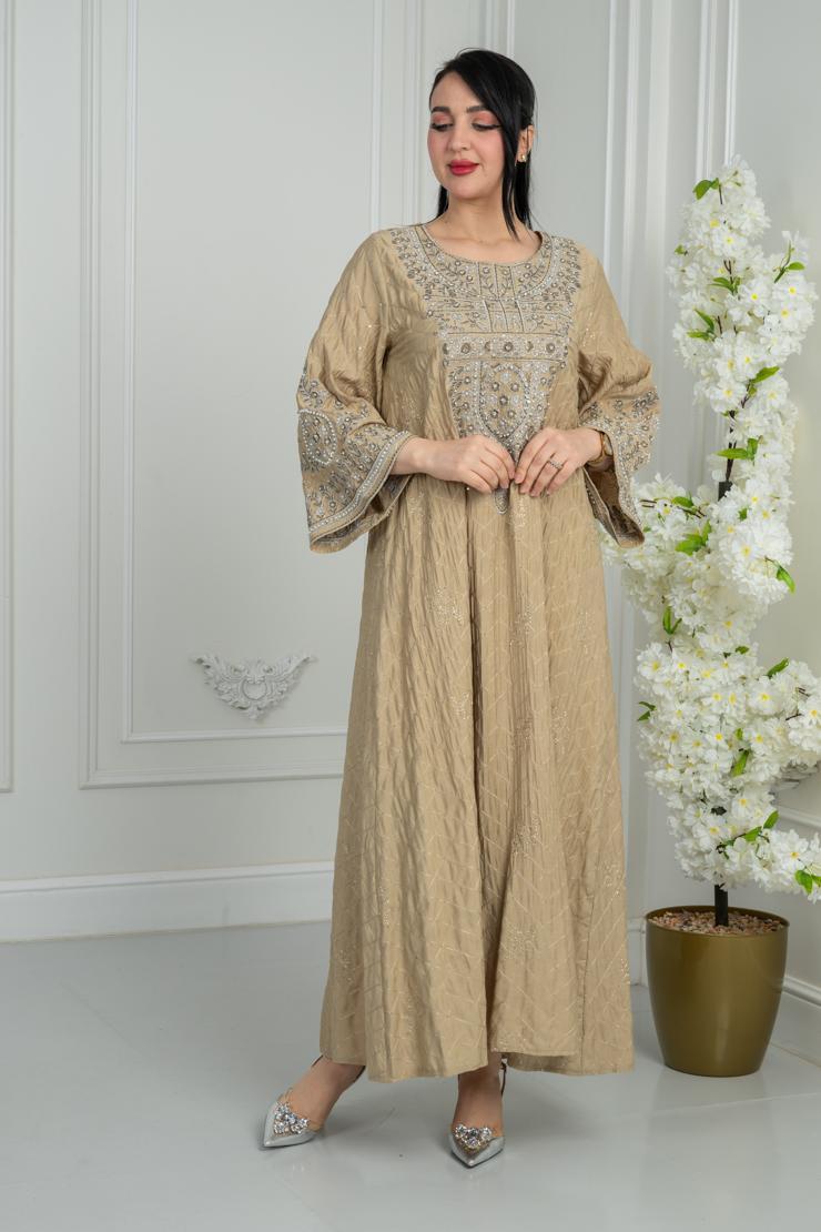 جلابية بتصميم واسع وقصة انسيابية، تأتي بلون بيج دافئ مزين بنقشة خفيفة تضيف لمسة أنيقة وهادئة، مناسبة للاستخدام اليومي والزيارات العائلية.