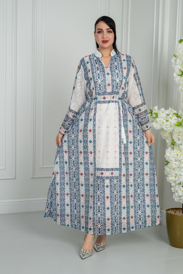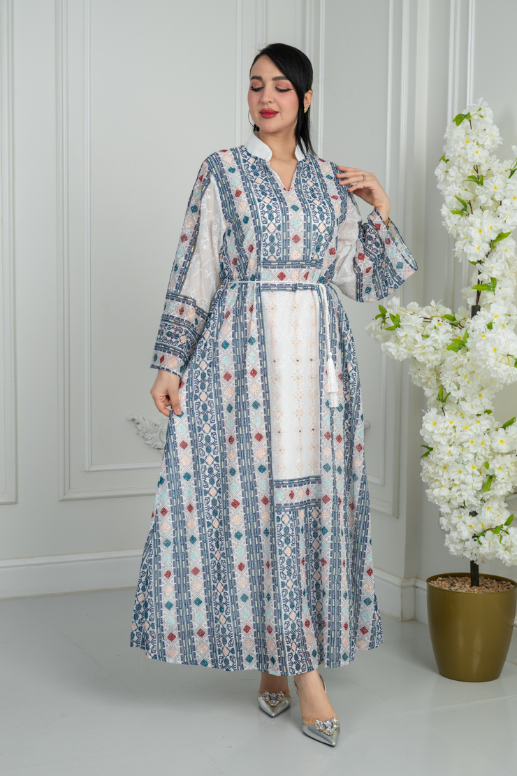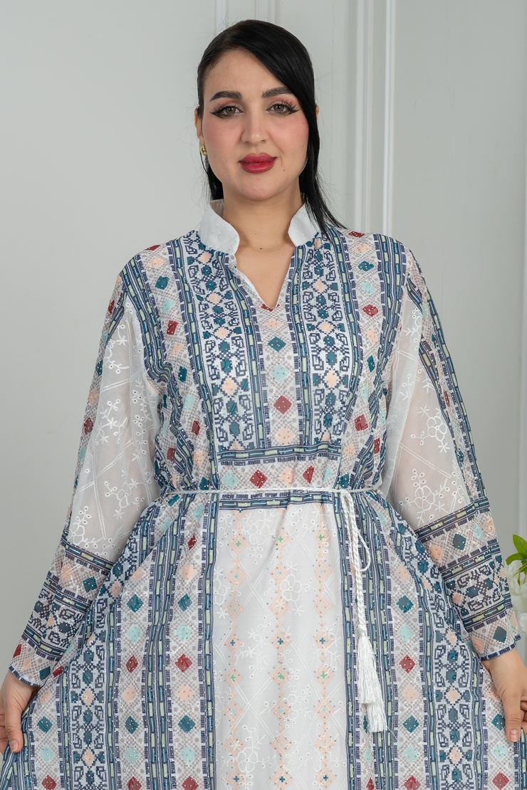 جلابية بلون أوف وايت مع نقشة تراثية ملونة لإطلالة أنثوية راقية.