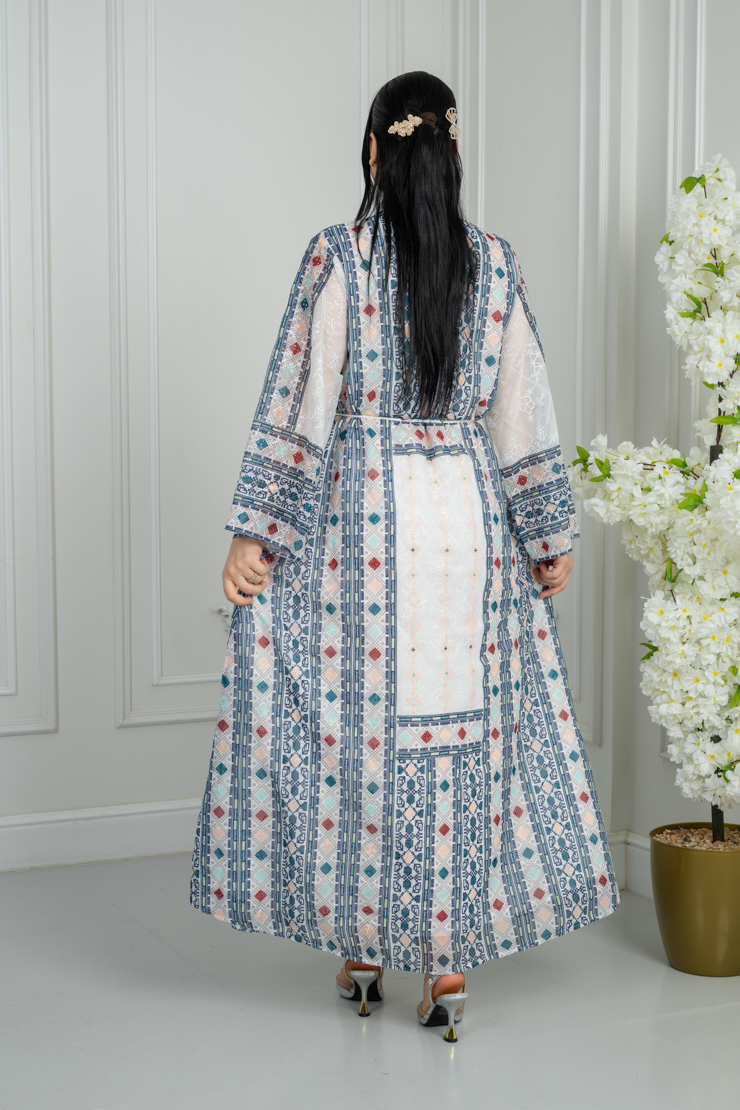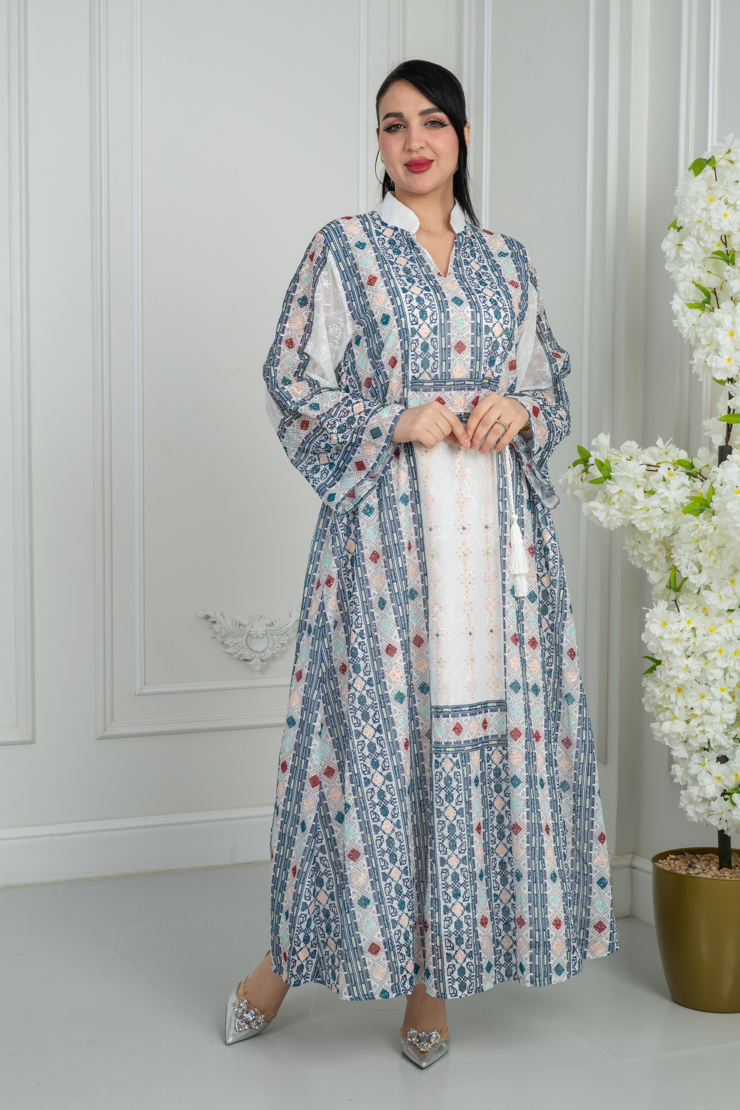 جلابية بتصميم واسع وانسيابي، تأتي بلون أوف وايت مزينة بنقشة تراثية ملونة موزعة بشكل متوازن على كامل القطعة، تمنحك مظهرًا أنيقًا يجمع بين الطابع الكلاسيكي والراحة اليومية.
