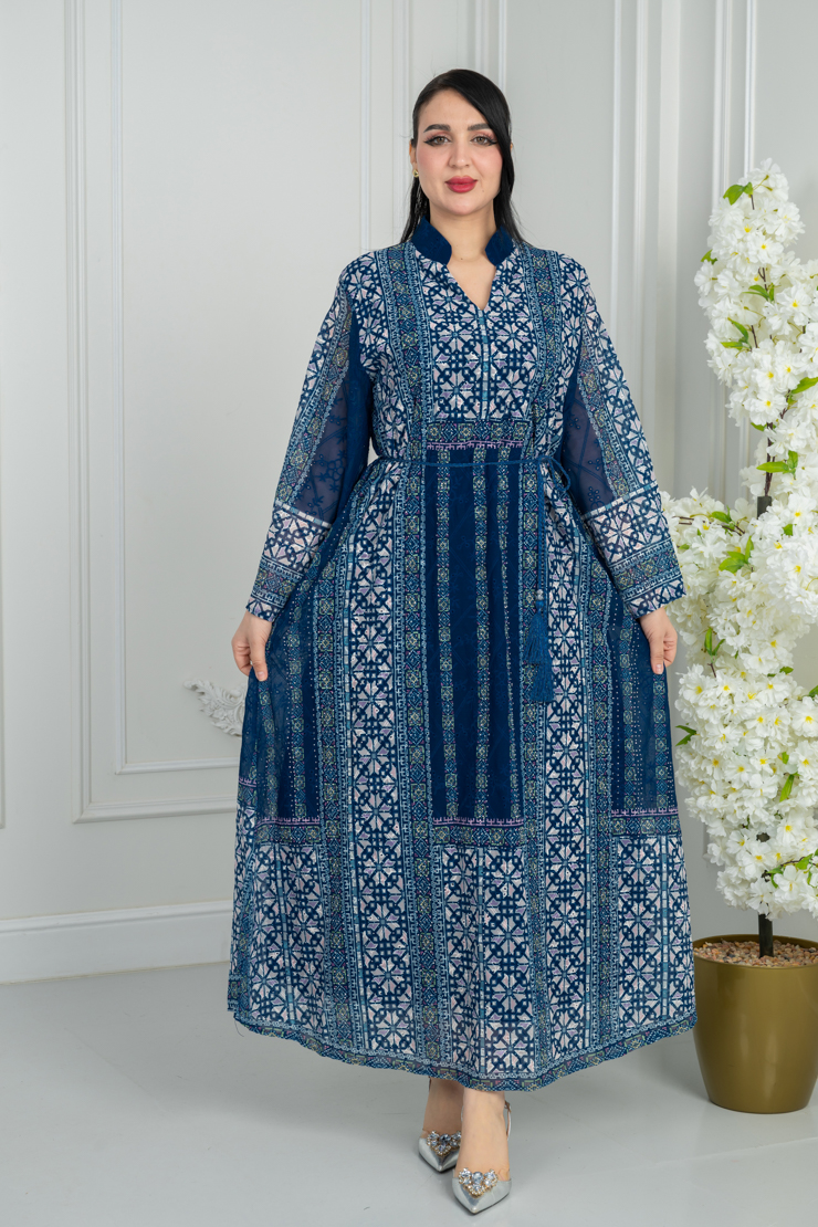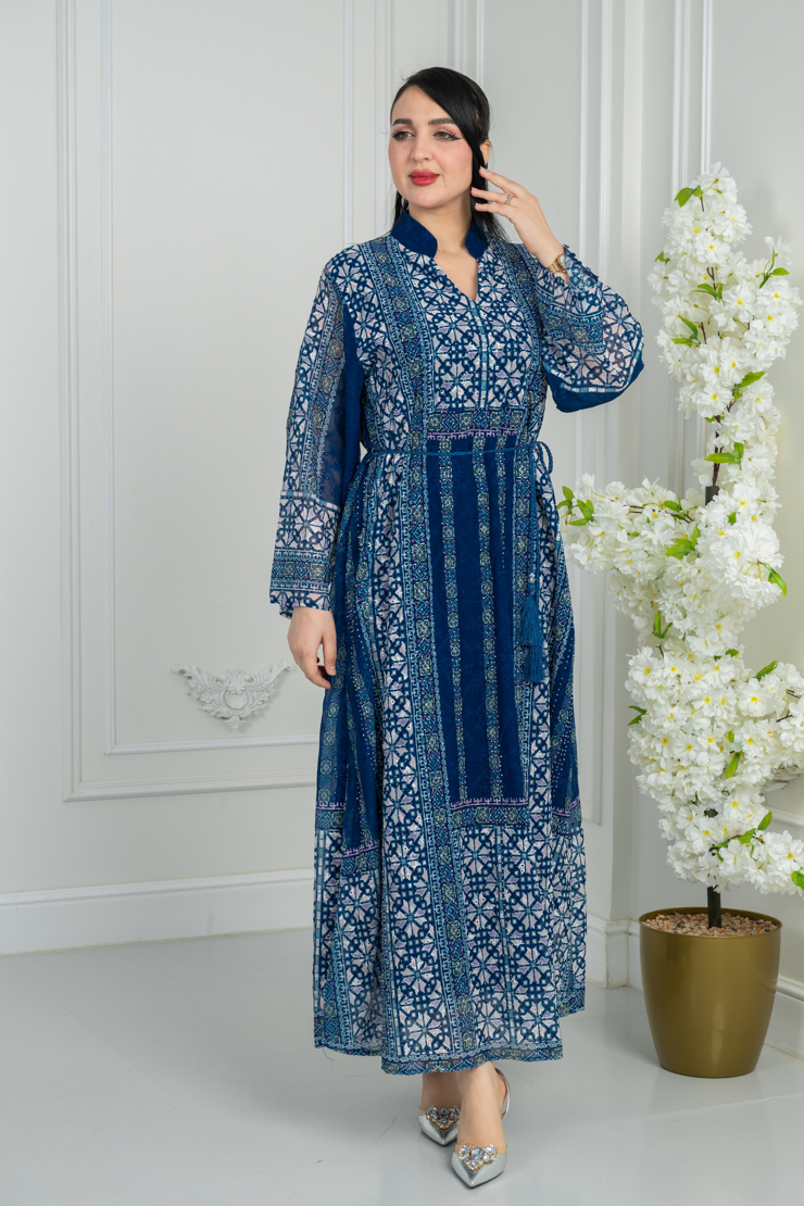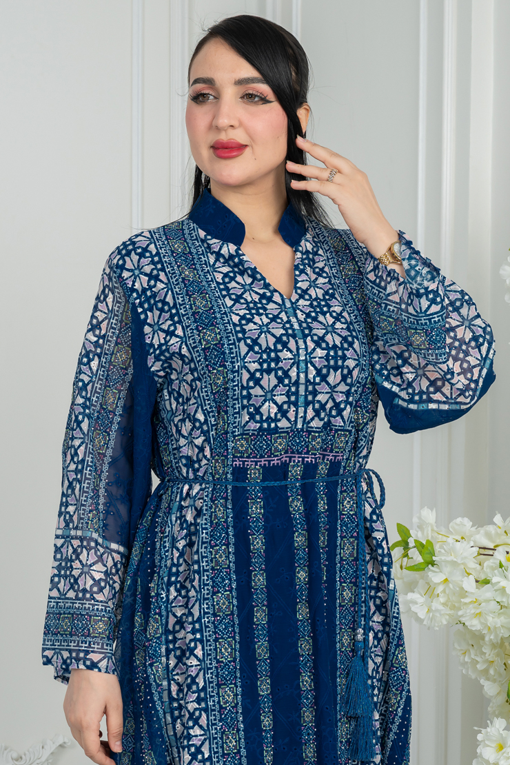 جلابية بلون أزرق داكن مع نقشة هندسية أنيقة لإطلالة فخمة.