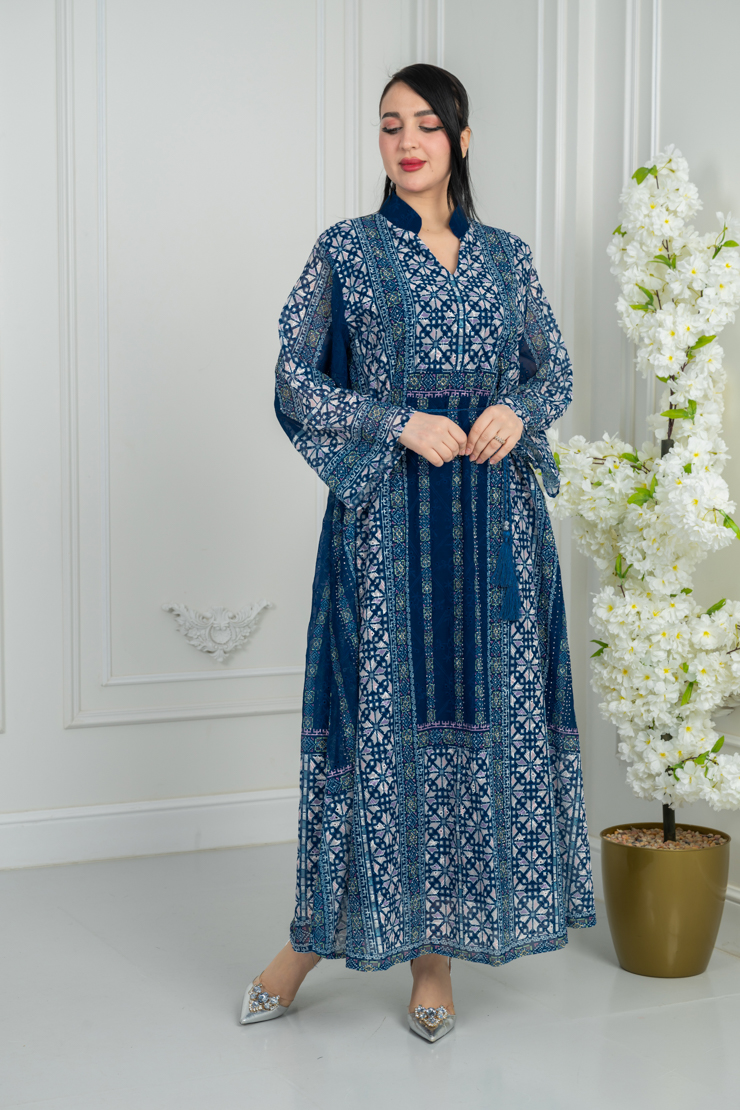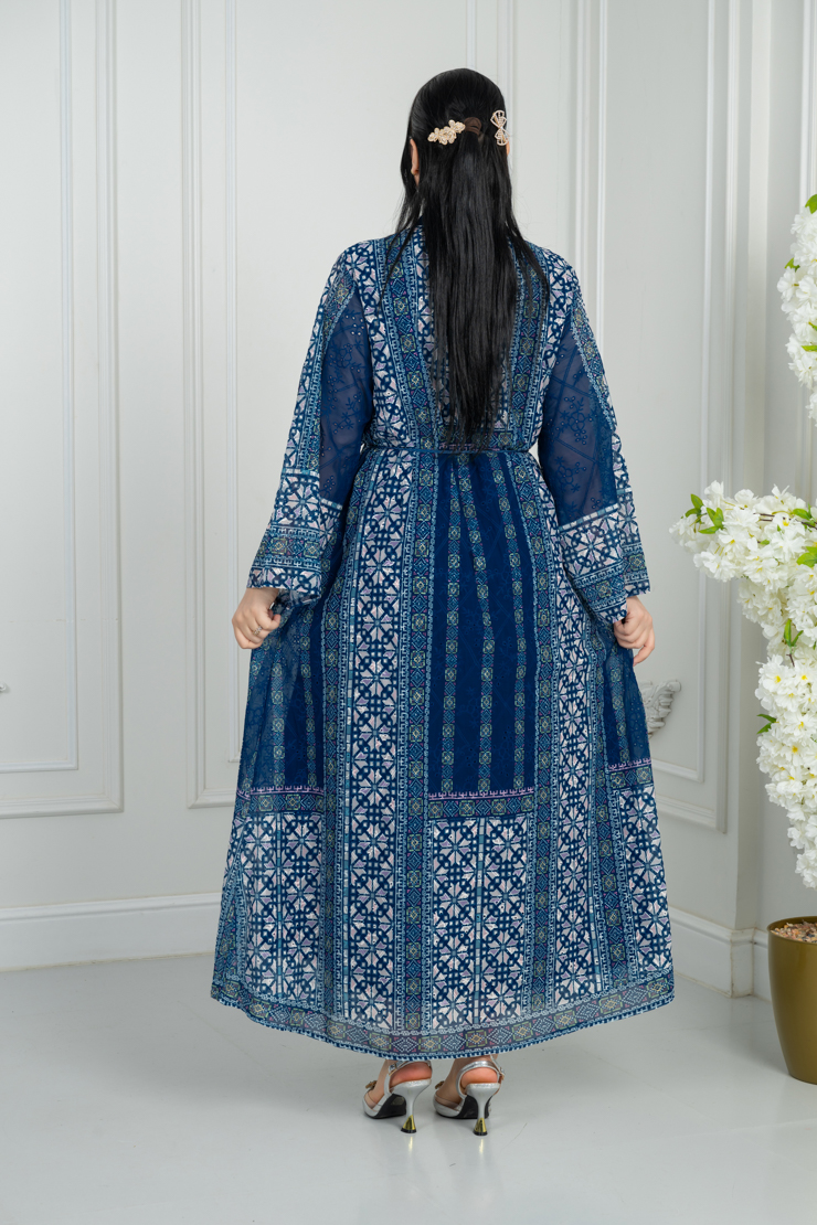 جلابية بتصميم أنيق وقصة مريحة، تأتي بلون أزرق داكن مزينة بنقشة هندسية متناسقة تضيف عمقًا وأناقة واضحة، مناسبة للزيارات والمناسبات اليومية الراقية.