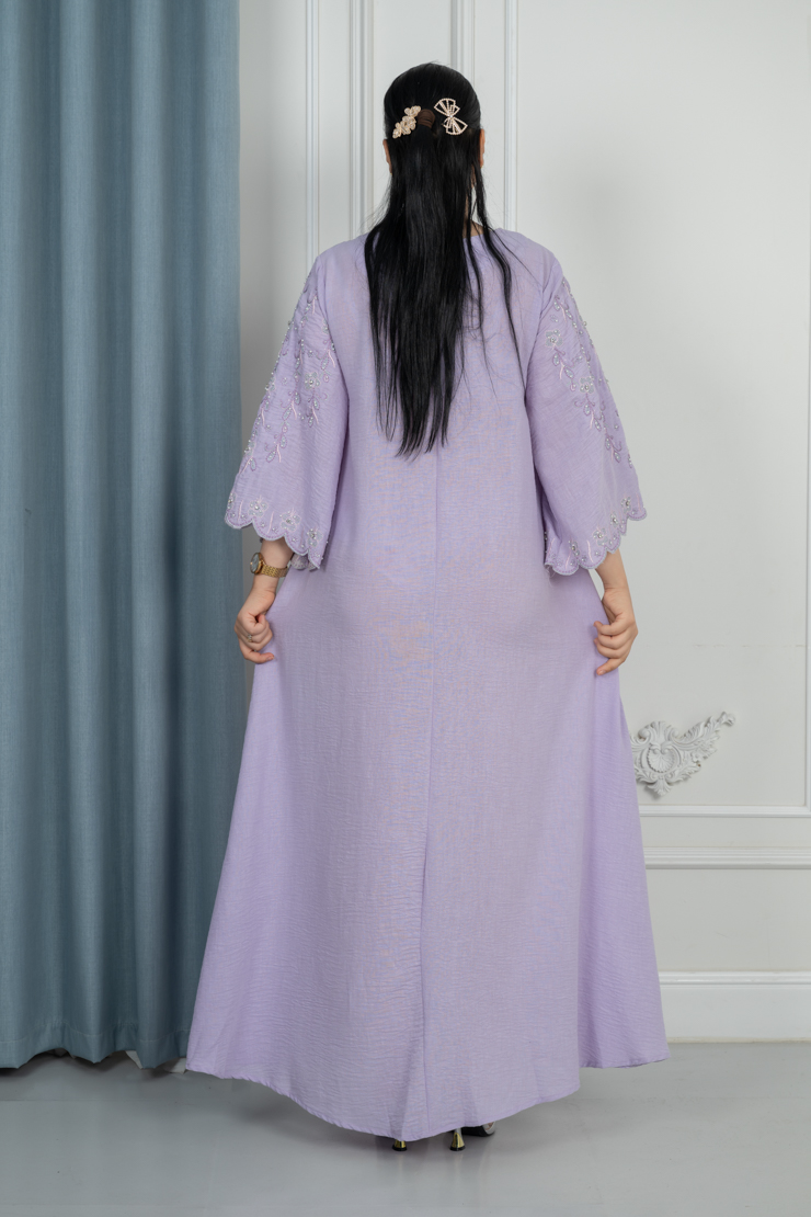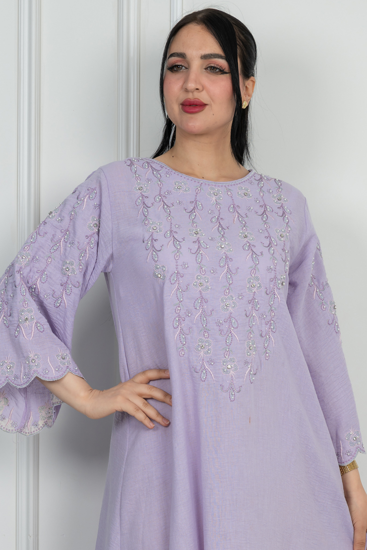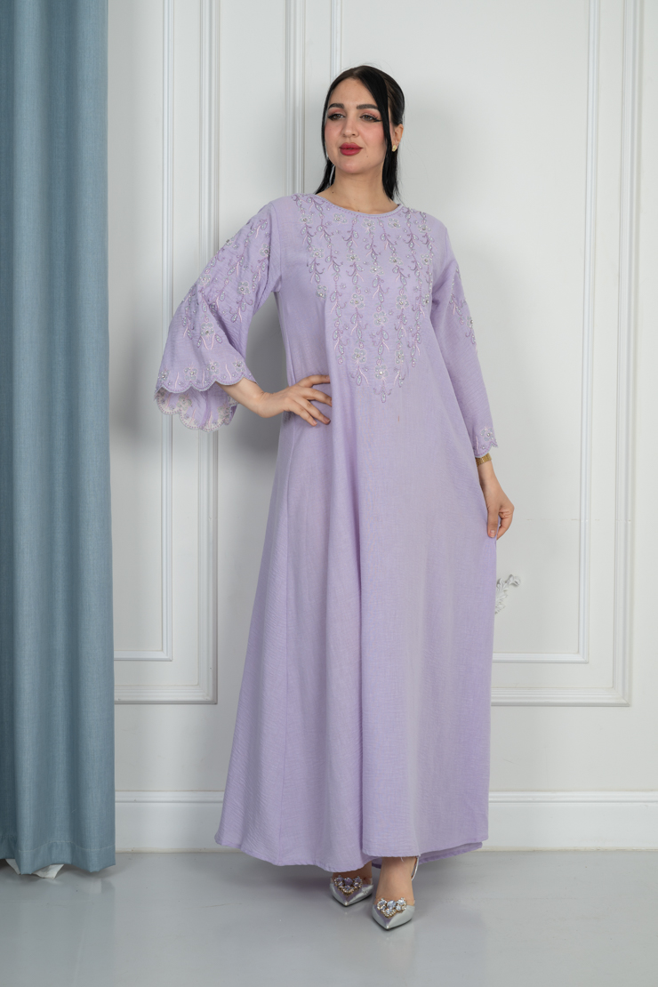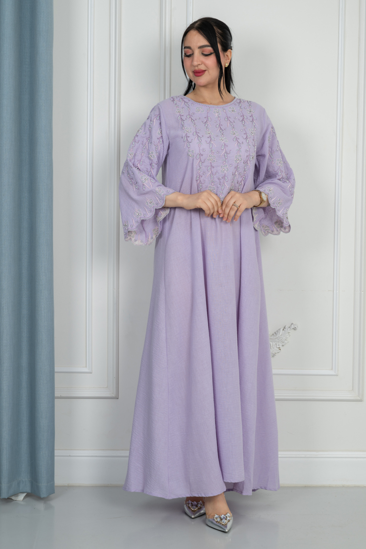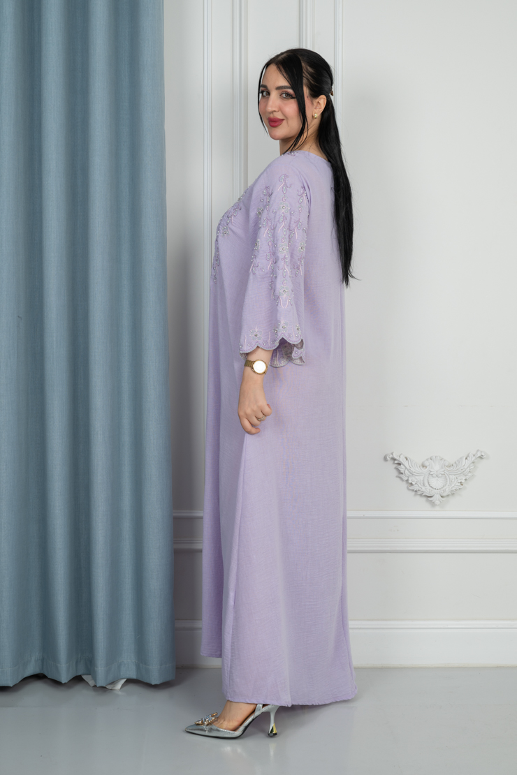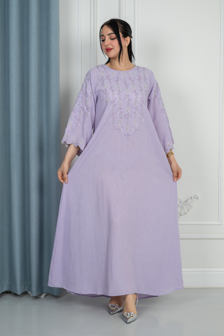 جلابية بلون موف فاتح بتصميم سادة لإطلالة ناعمة ومريحة.