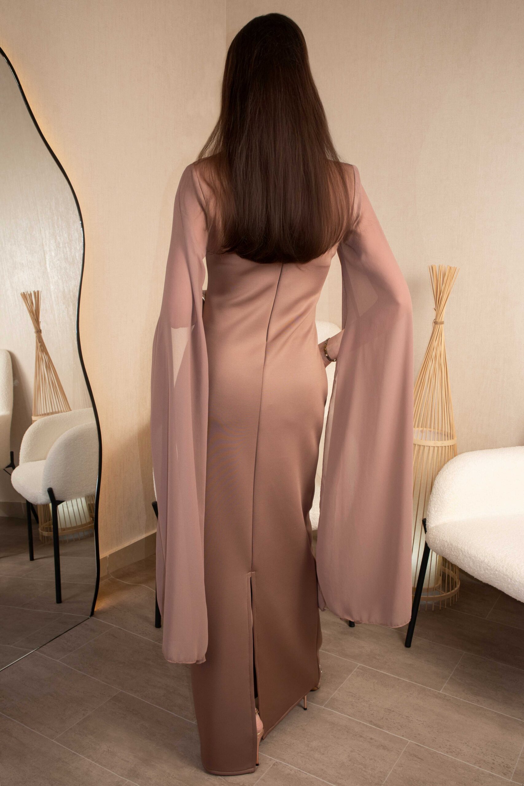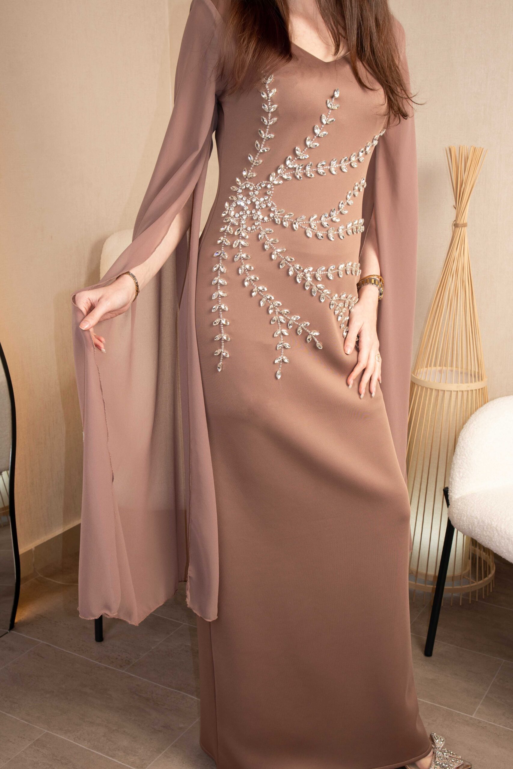 فستان سهرة طويل بلون بني فاتح مع تطريز ناعم وأكمام شال أنيقة.