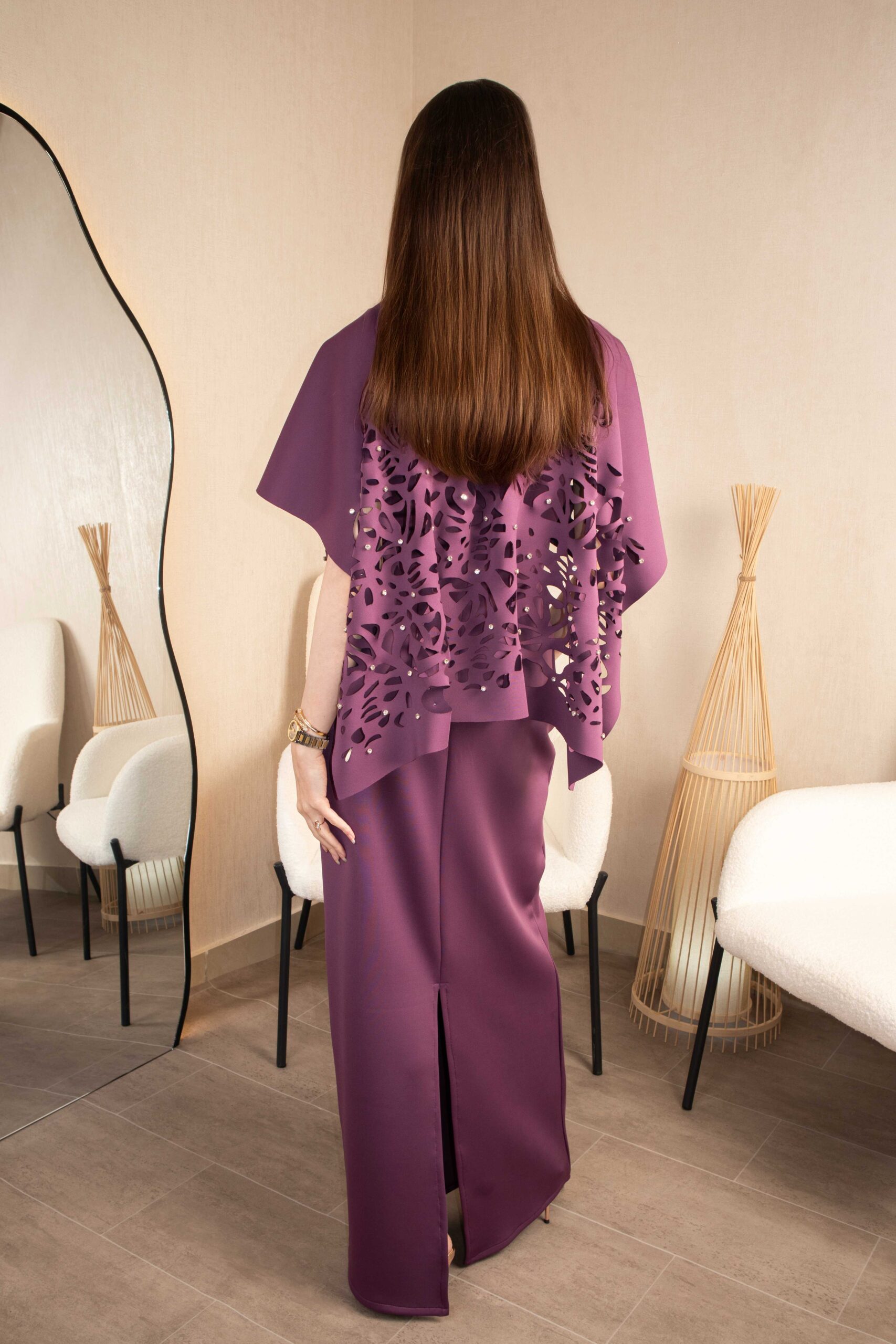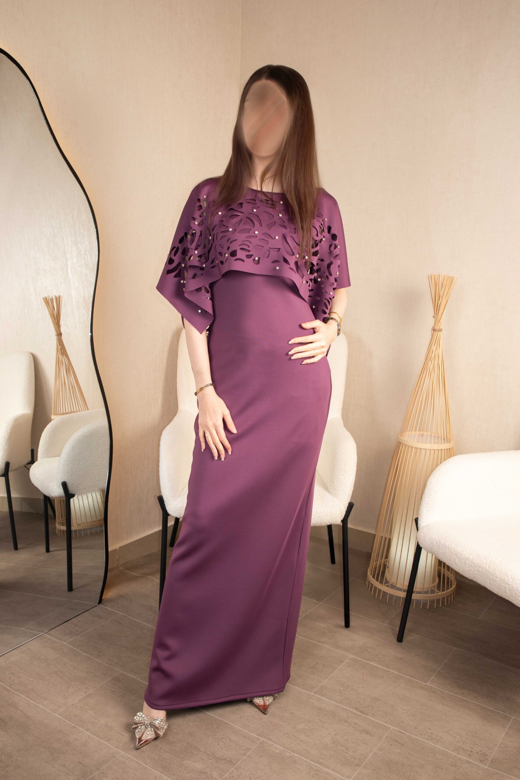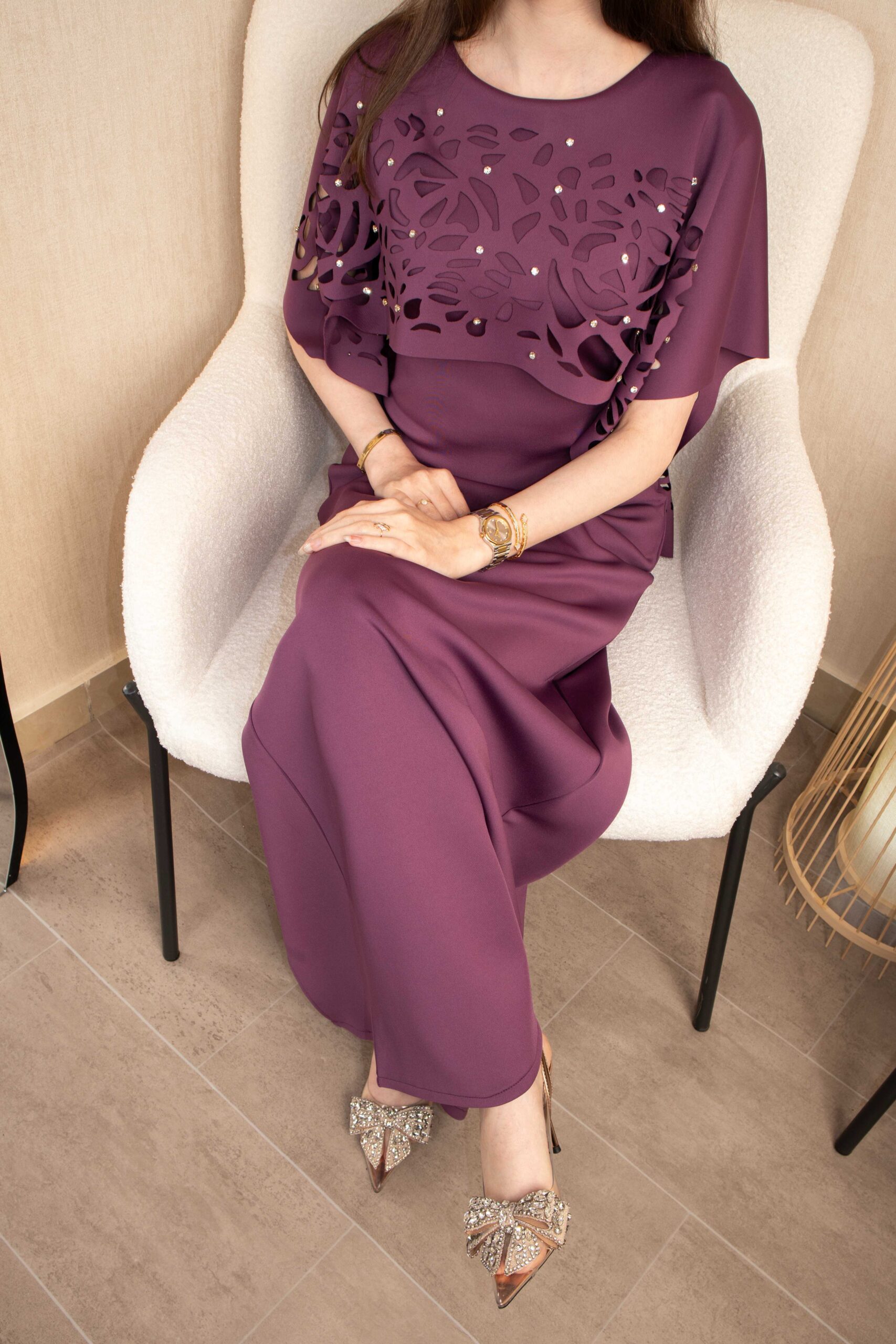 فستان ماكسي أنيق باللون الأرجواني بتفاصيل دانتيل راقية ولمسة فخامة ناعمة.