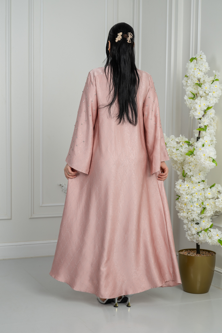 جلابية بتصميم واسع وانسيابي، تأتي بلون وردي فاتح يعكس الأنوثة والهدوء، مع قصة مريحة تناسب الاستخدام اليومي والزيارات، وتمنحك إطلالة بسيطة وأنيقة بدون مبالغة.