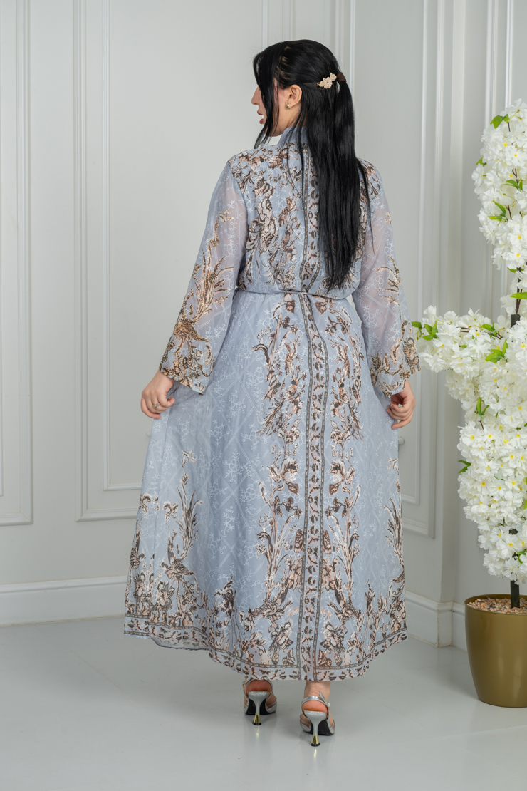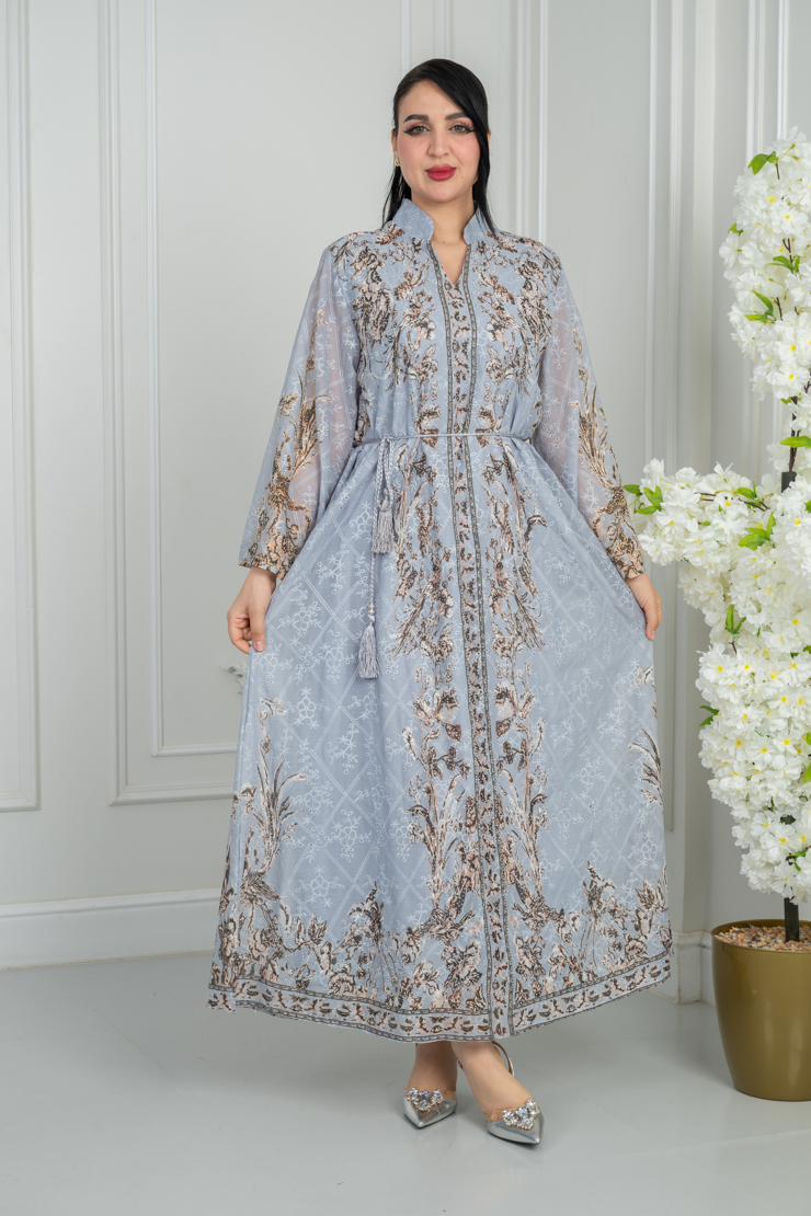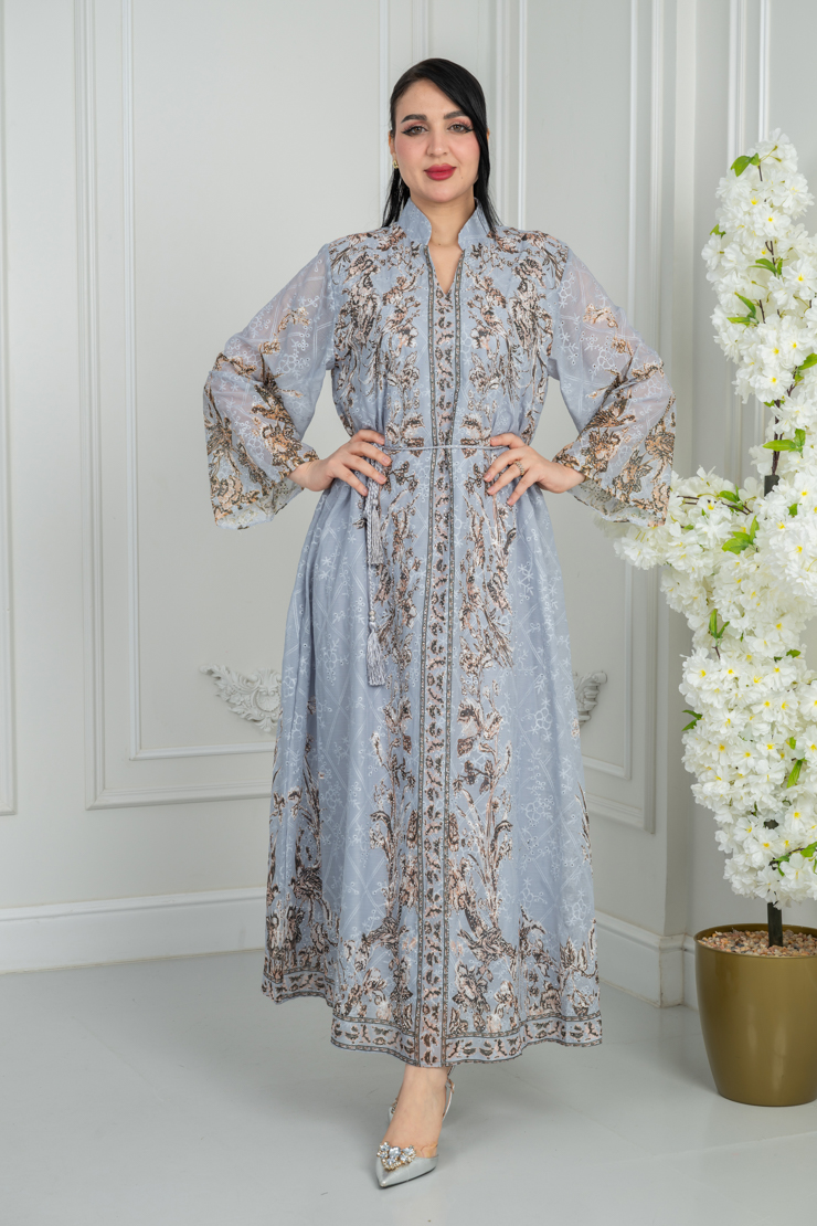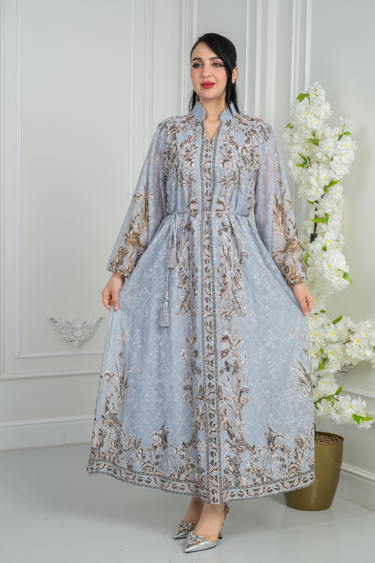 جلابية رمادية فاتحة بنقشة تراثية راقية.