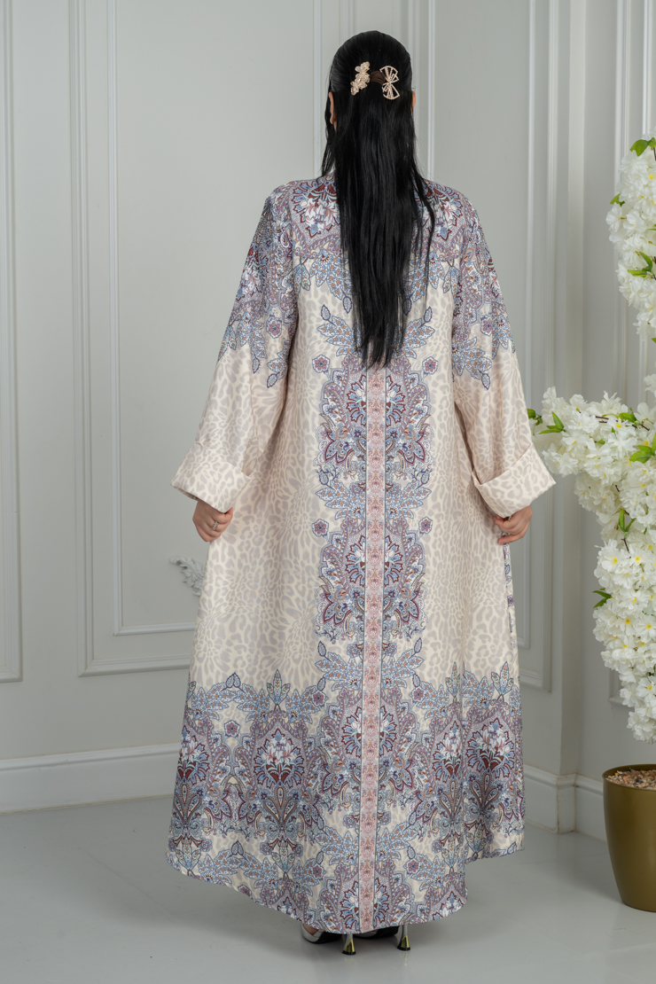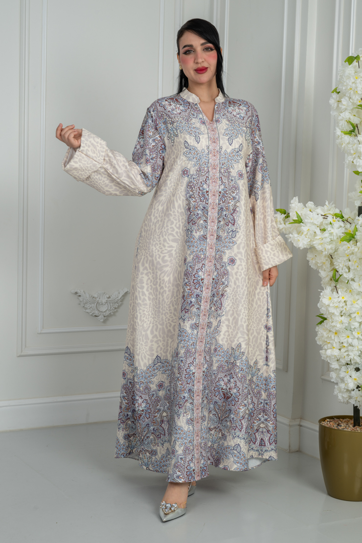 جلابية بتصميم واسع وانسيابي، تأتي بلون أوف وايت مع تدرج لوني بنفسجي هادئ في الأسفل يضيف عمقًا وأناقة، مناسبة للاستخدام اليومي والزيارات الهادئة.
