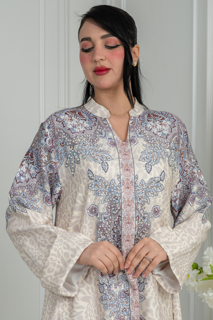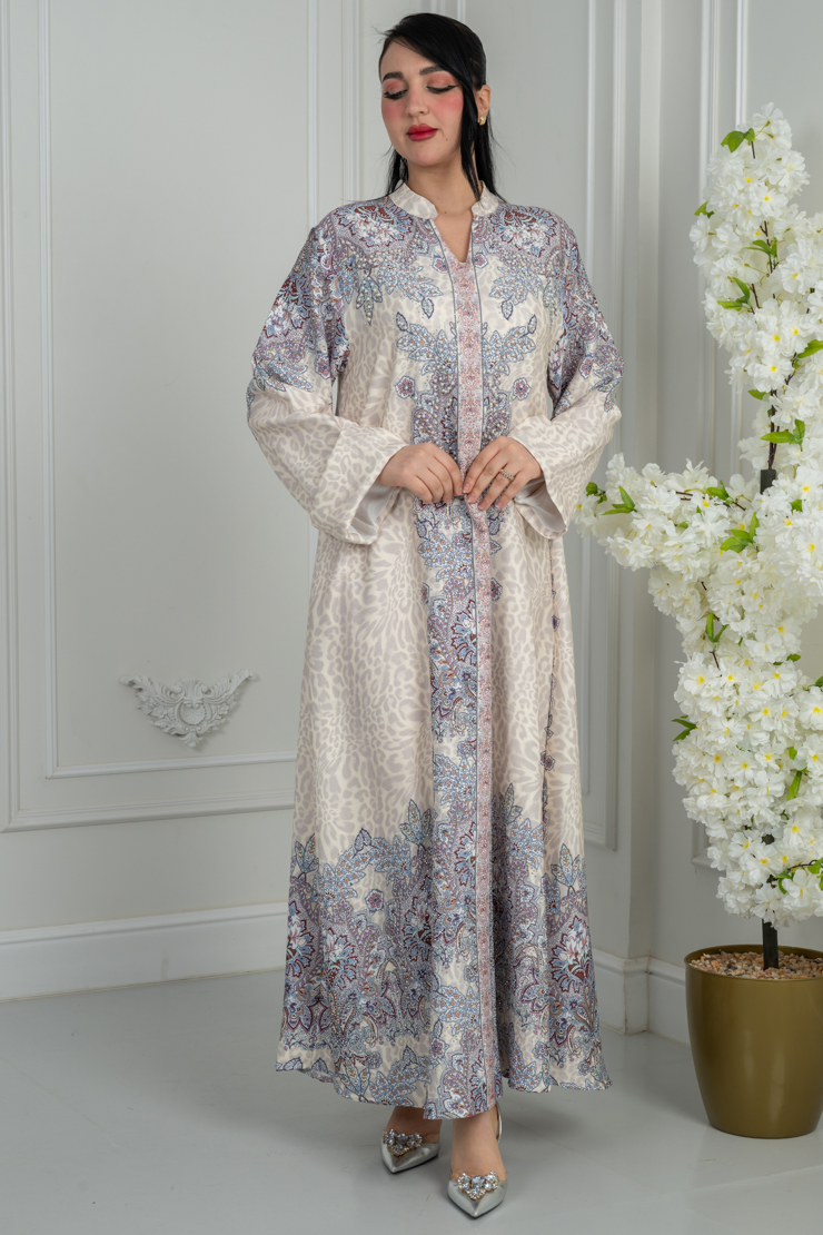 جلابية بلون أوف وايت مع تدرج بنفسجي ناعم لإطلالة راقية.