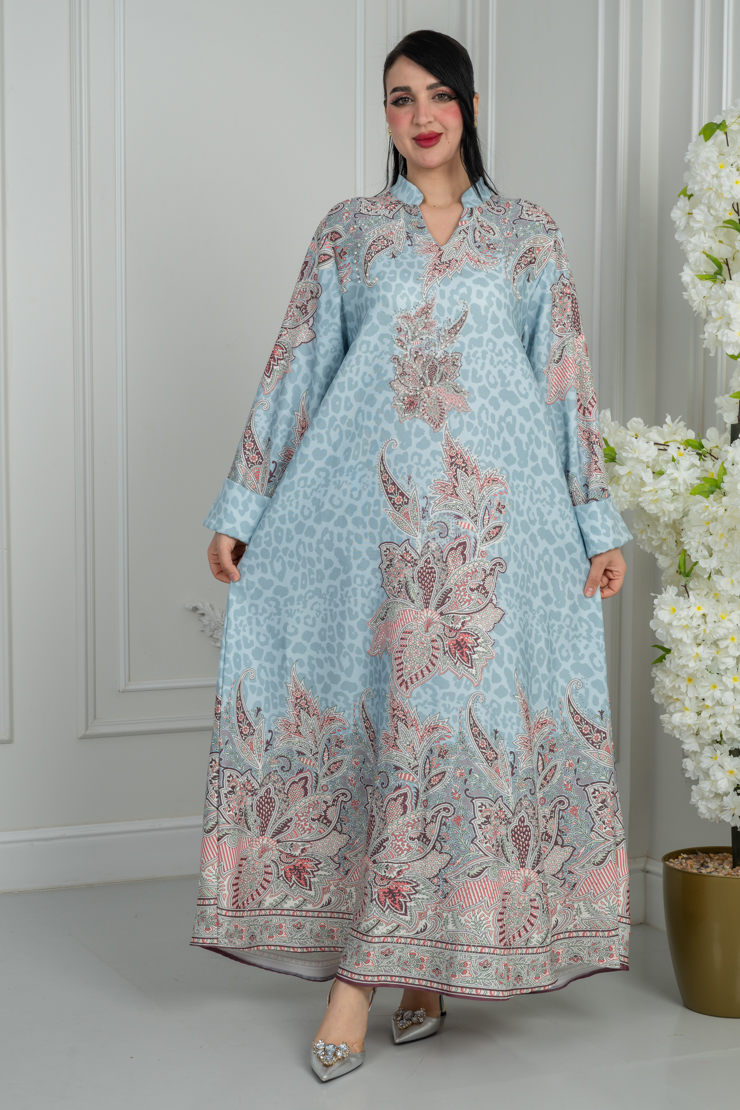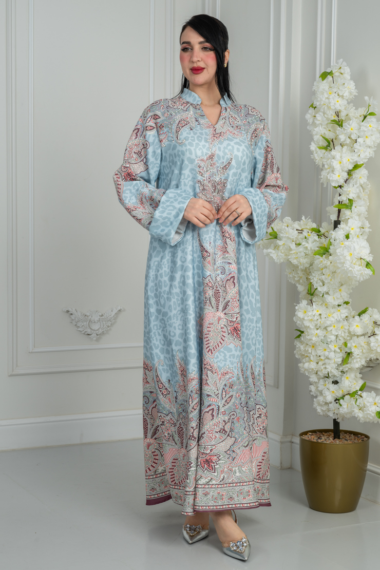 جلابية بلون أزرق فاتح مع نقشة وردية لإطلالة أنثوية مميزة.