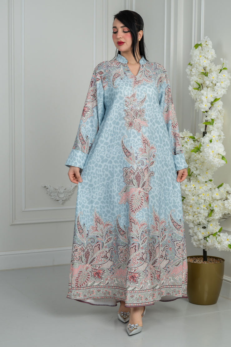 جلابية بتصميم واسع وانسيابي، تأتي بلون أزرق فاتح مزين بنقشة وردية ناعمة تضيف لمسة أنثوية جذابة، مناسبة للاستخدام اليومي والزيارات.