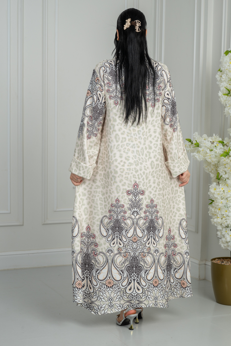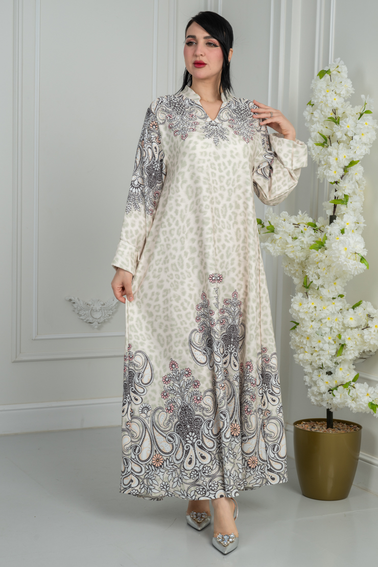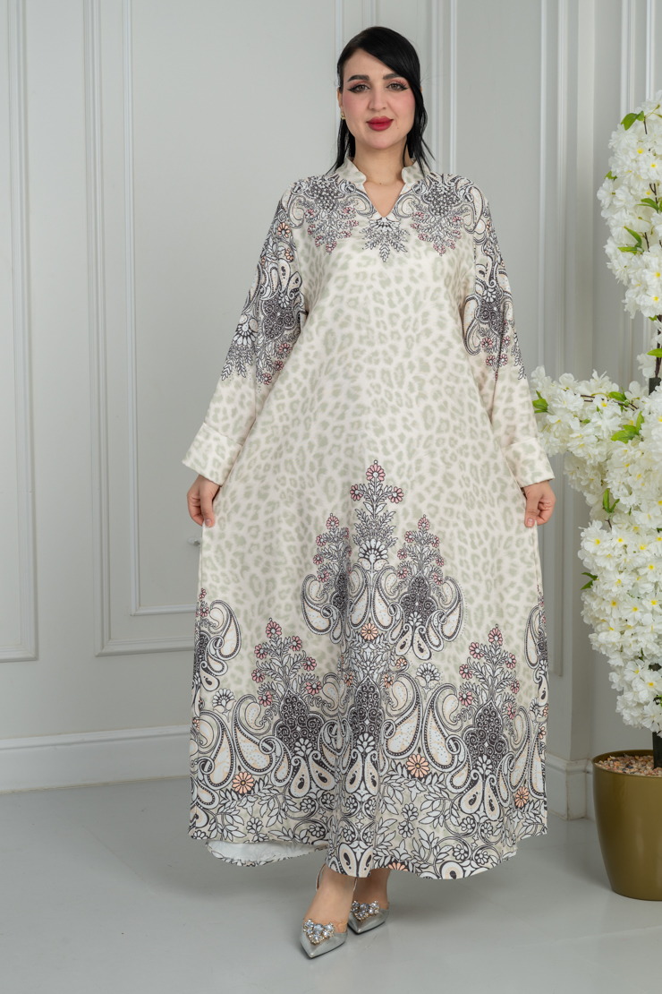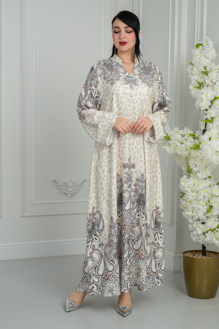 جلابية بلون أوف وايت مع نقشة فنية لإطلالة راقية.