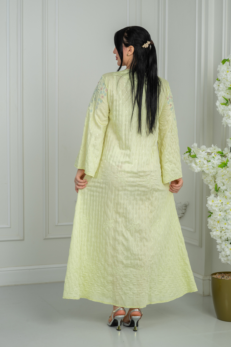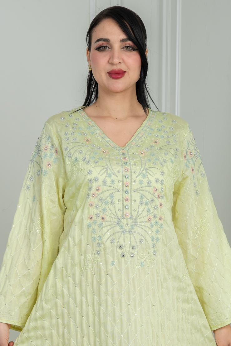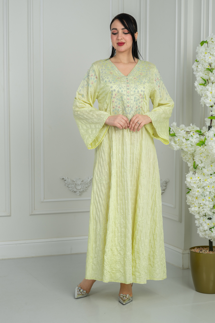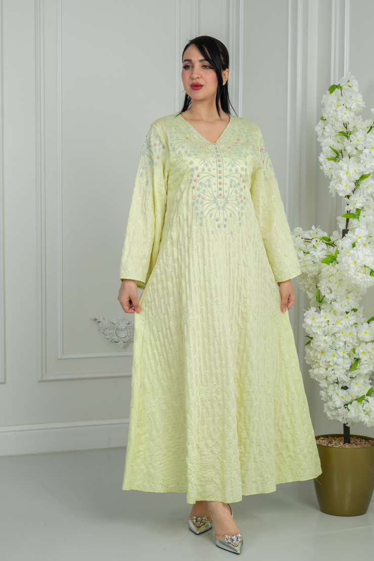 جلابية بلون أصفر فاتح مع نقشة ناعمة لإطلالة مشرقة ومريحة.