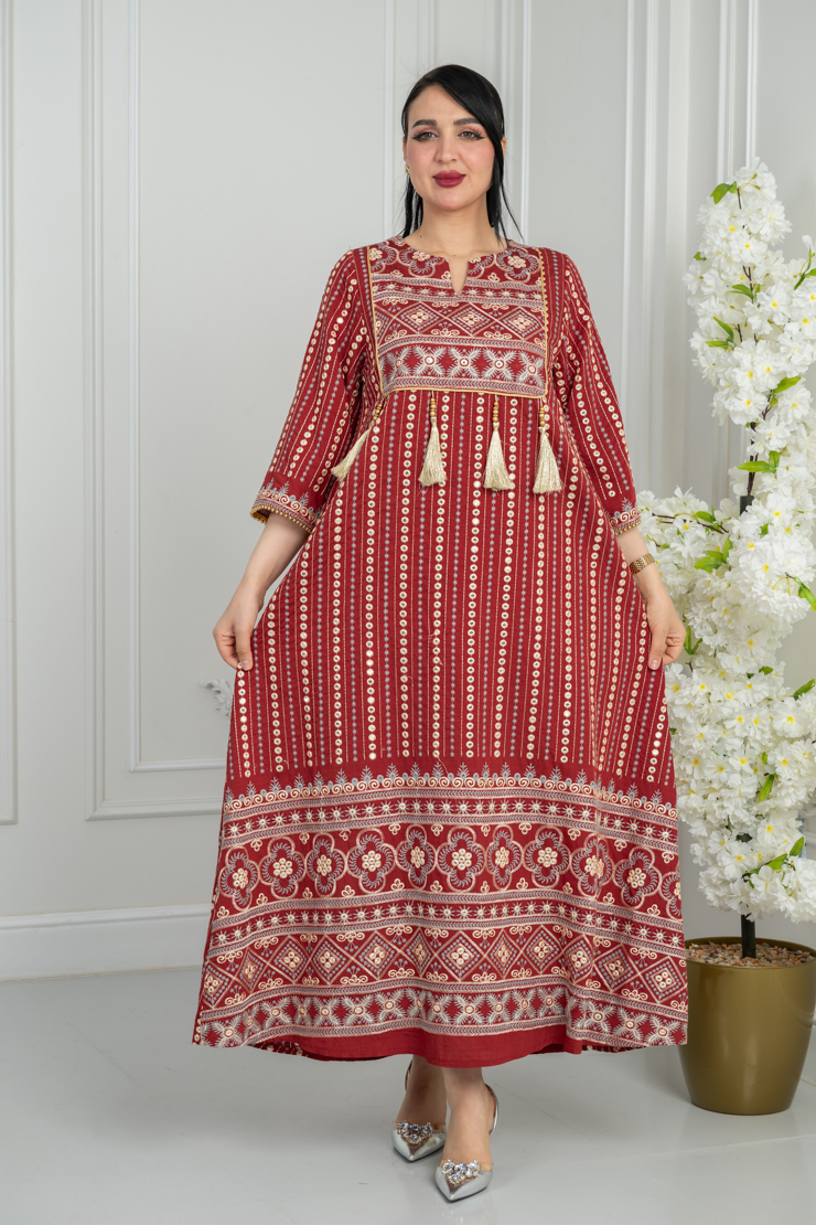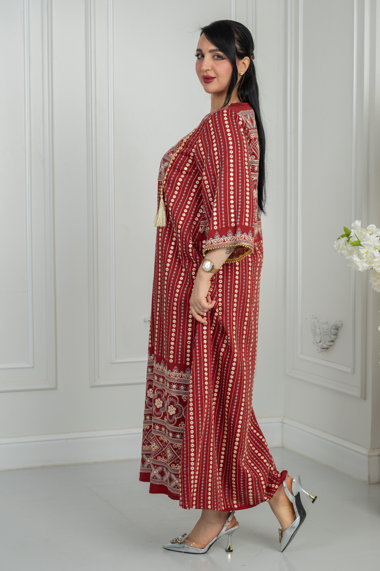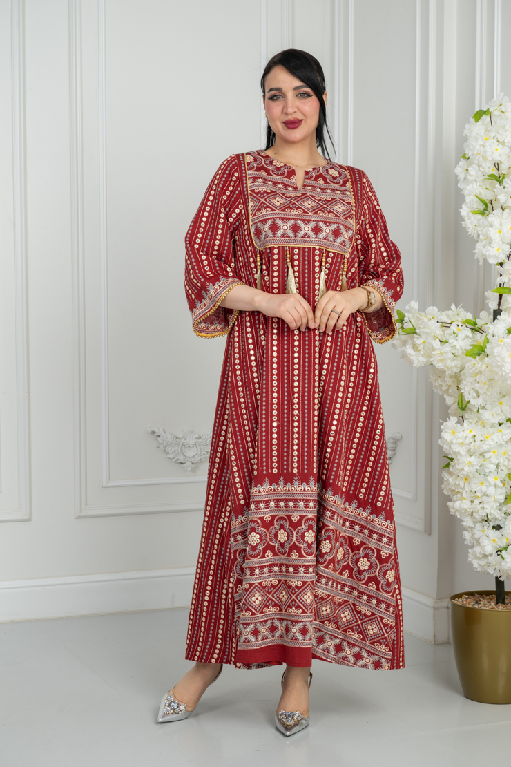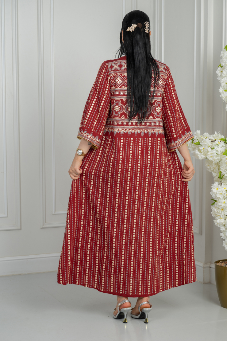 جلابية بلون أحمر مع نقشة تراثية لإطلالة جريئة ومميزة.