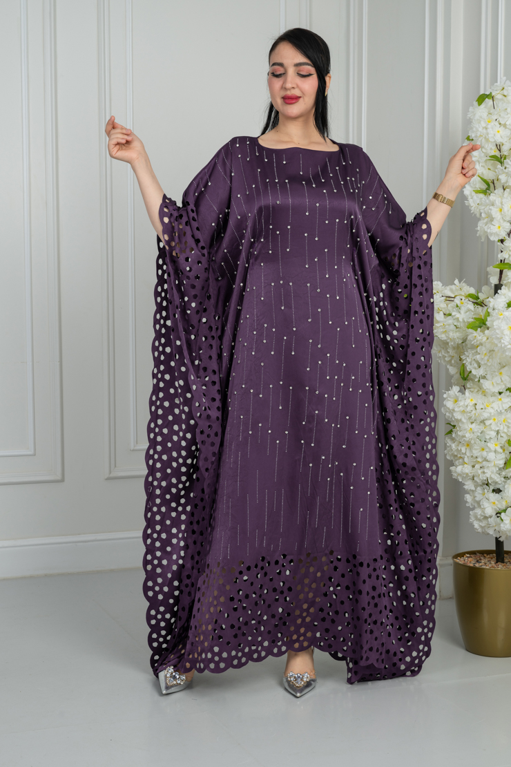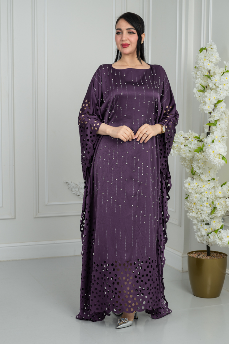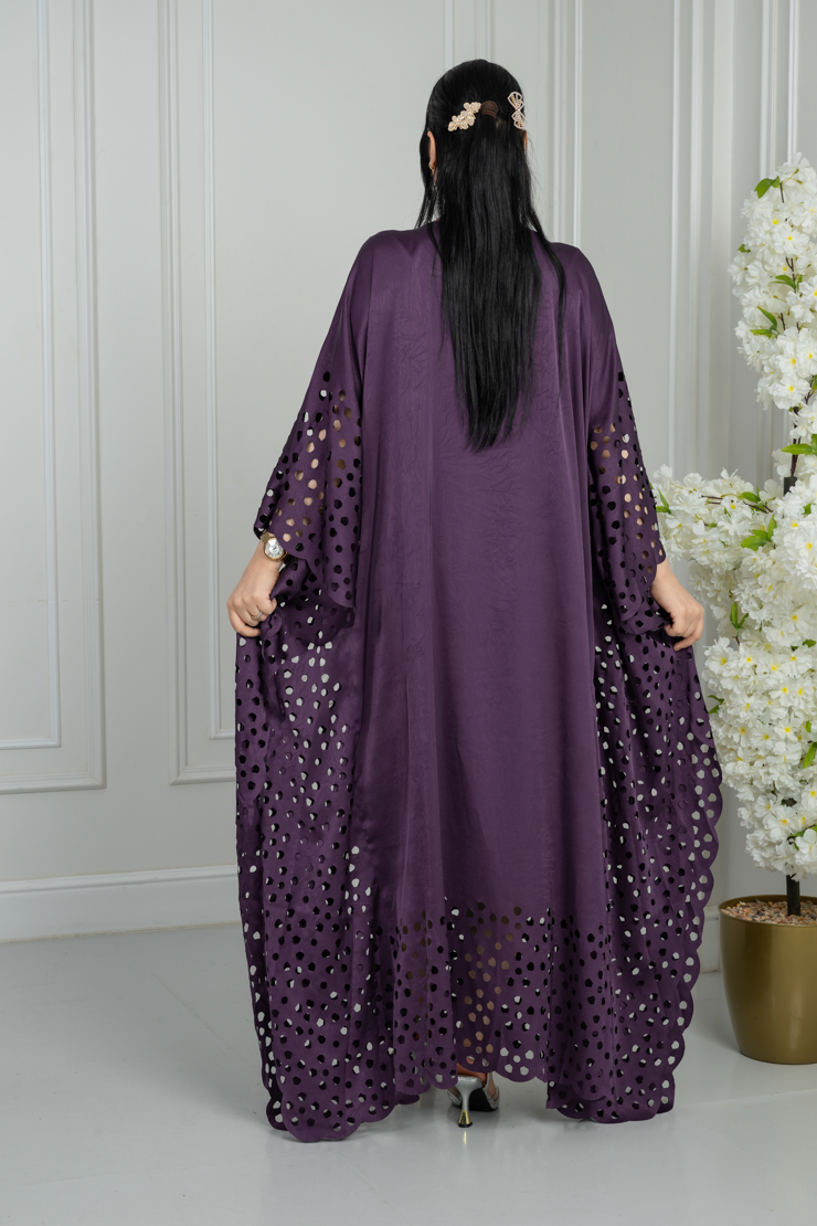 جلابية بتصميم واسع وقصة مريحة، تأتي بلون بنفسجي داكن مزينة بنقشة خفيفة موزعة على كامل القطعة تضيف لمسة فخامة أنيقة، مناسبة للمناسبات اليومية والزيارات الخاصة.