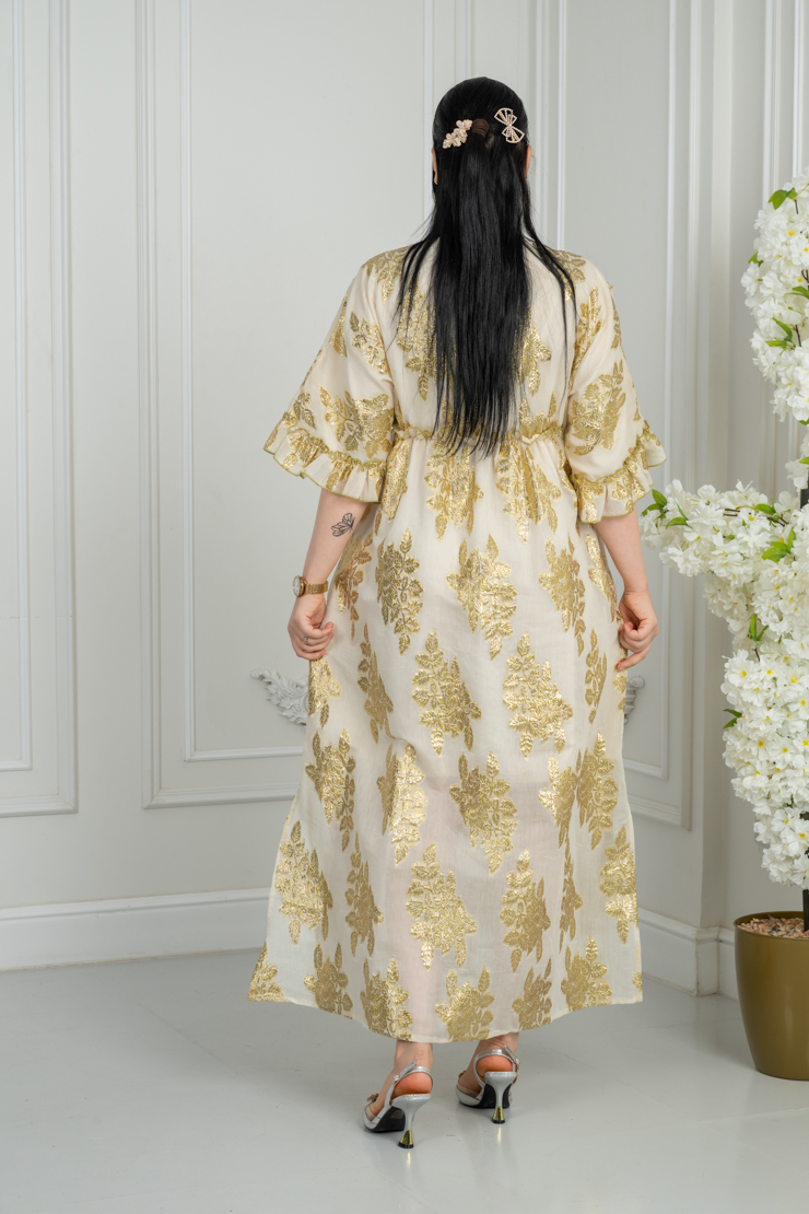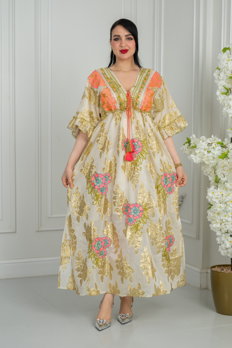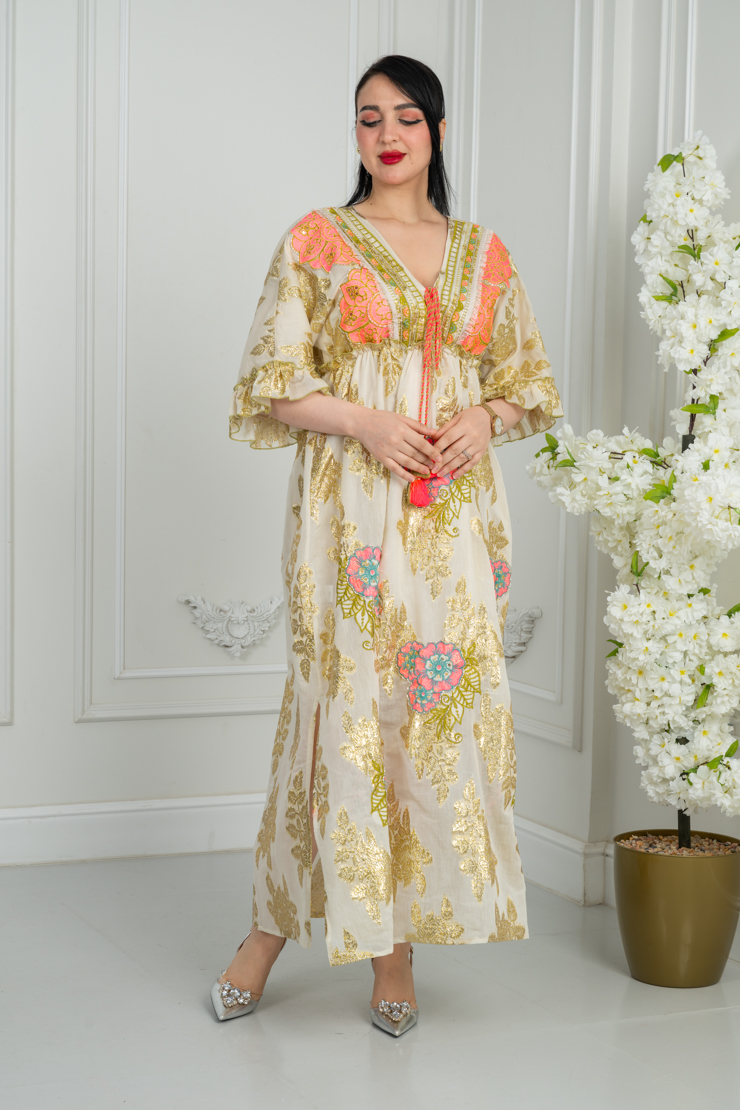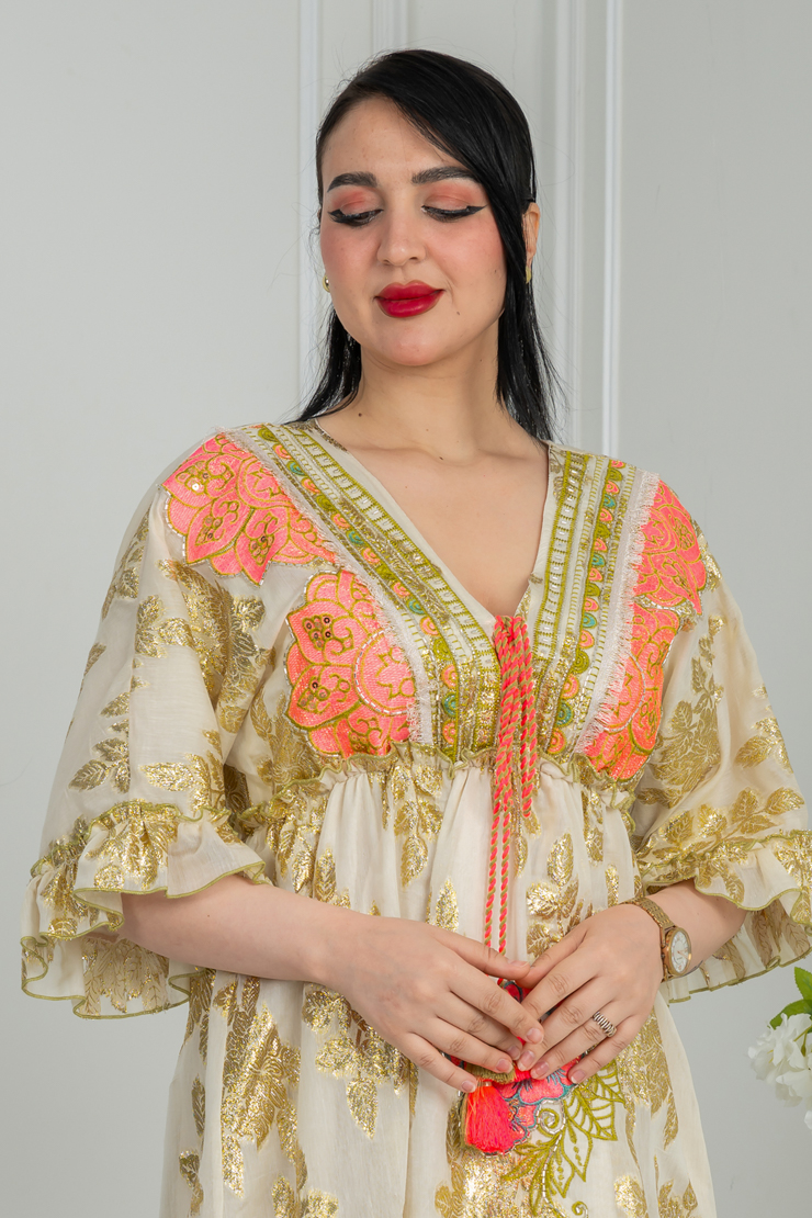 جلابية بلون أوف وايت مع نقشة زهرية ملونة لإطلالة مشرقة وأنثوية.