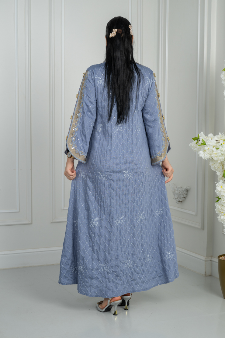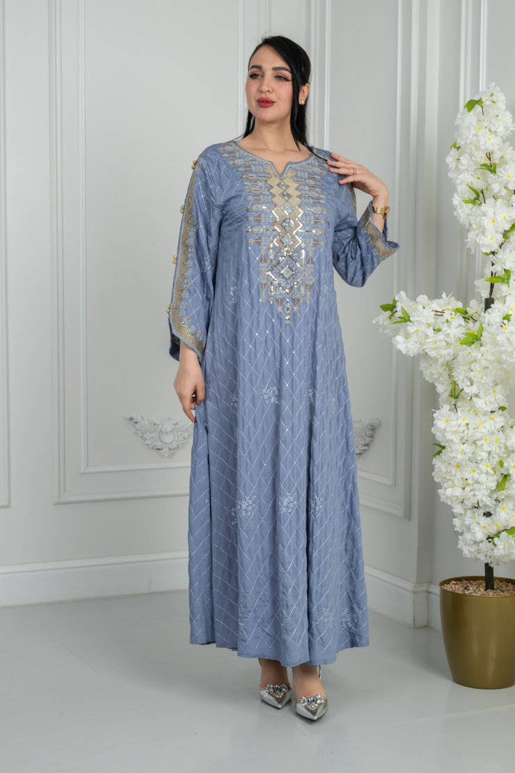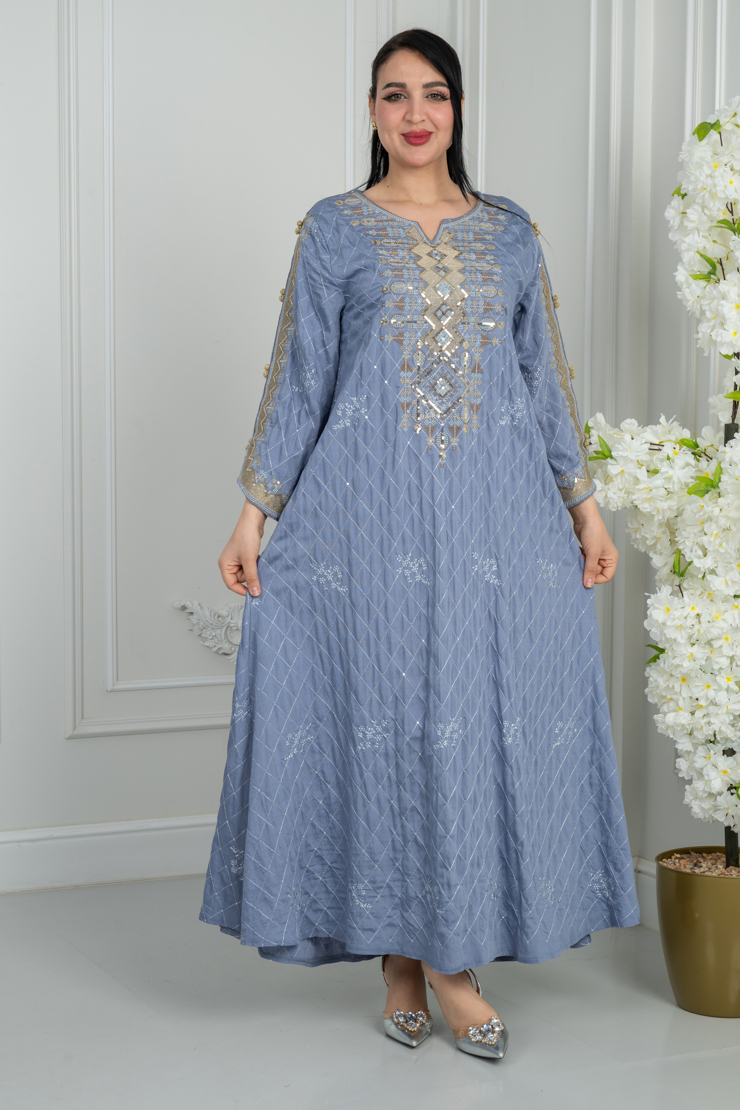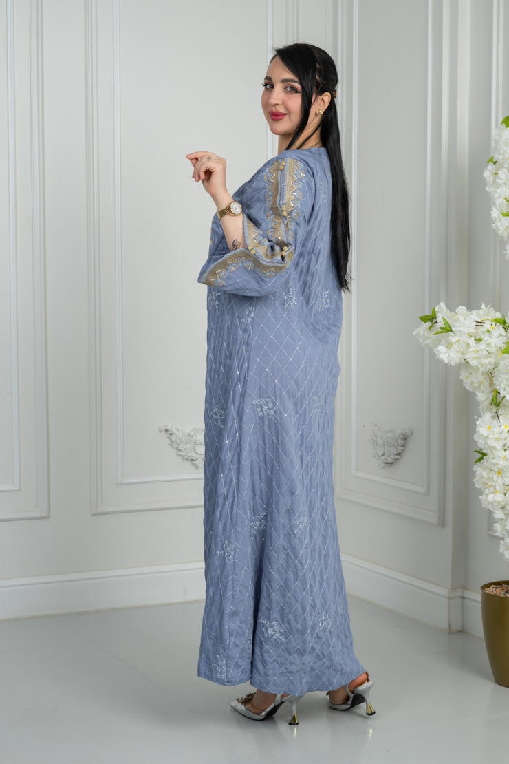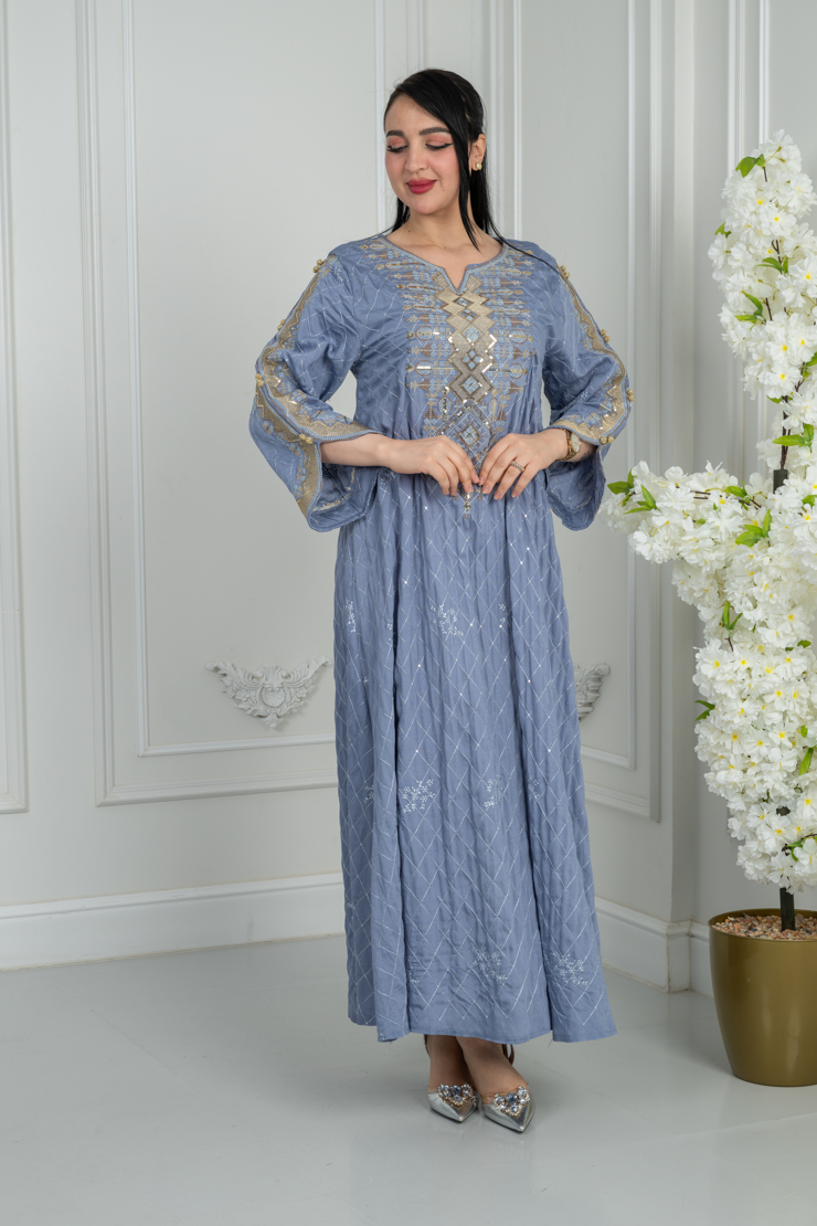 جلابية بلون أزرق فاتح مع تطريز ناعم لإطلالة هادئة وأنيقة.