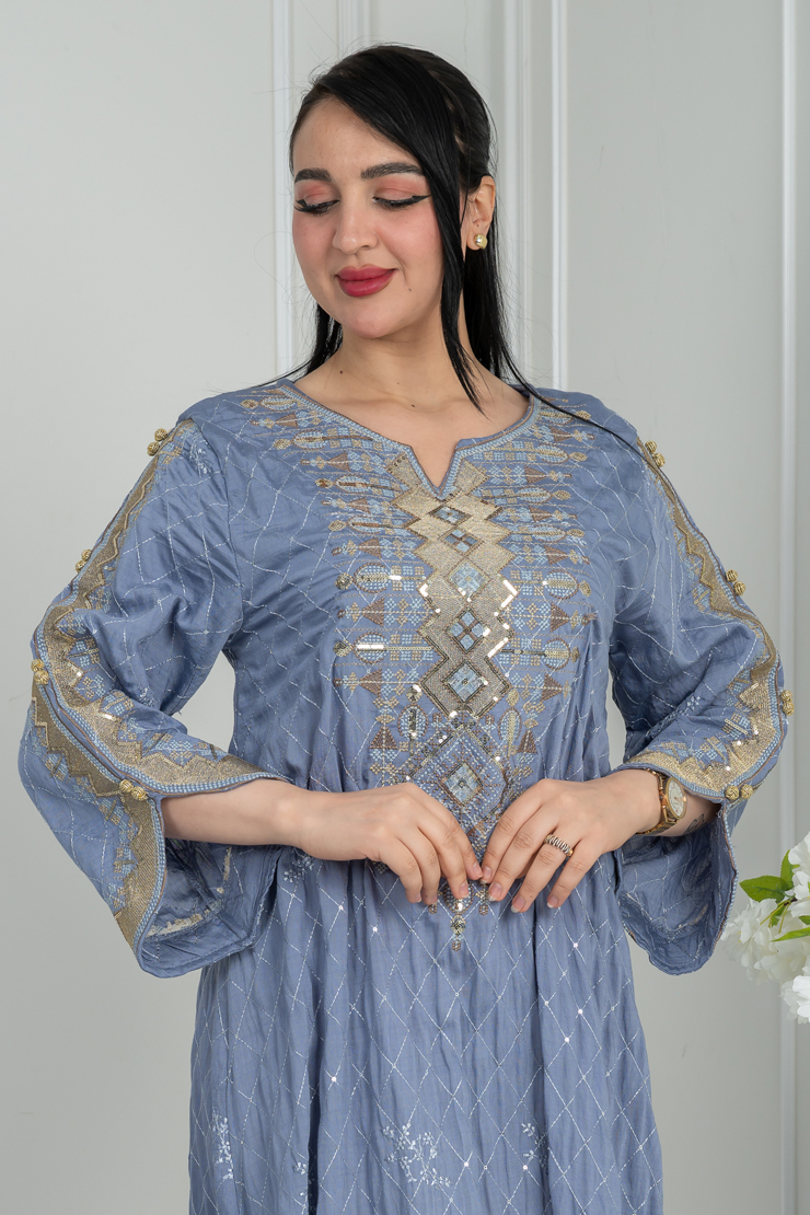 جلابية بتصميم أنيق وقصة مريحة، تأتي بلون أزرق فاتح مع تطريز متقن على الصدر والأكمام يضيف لمسة راقية، مناسبة للاستخدام اليومي والزيارات والمناسبات البسيطة.