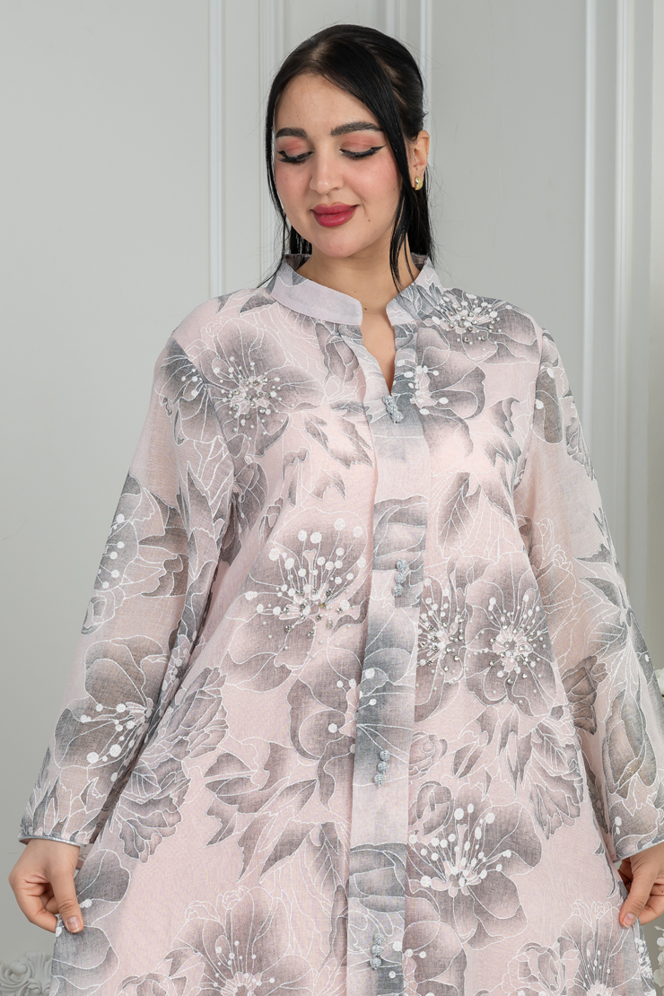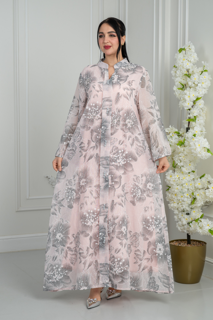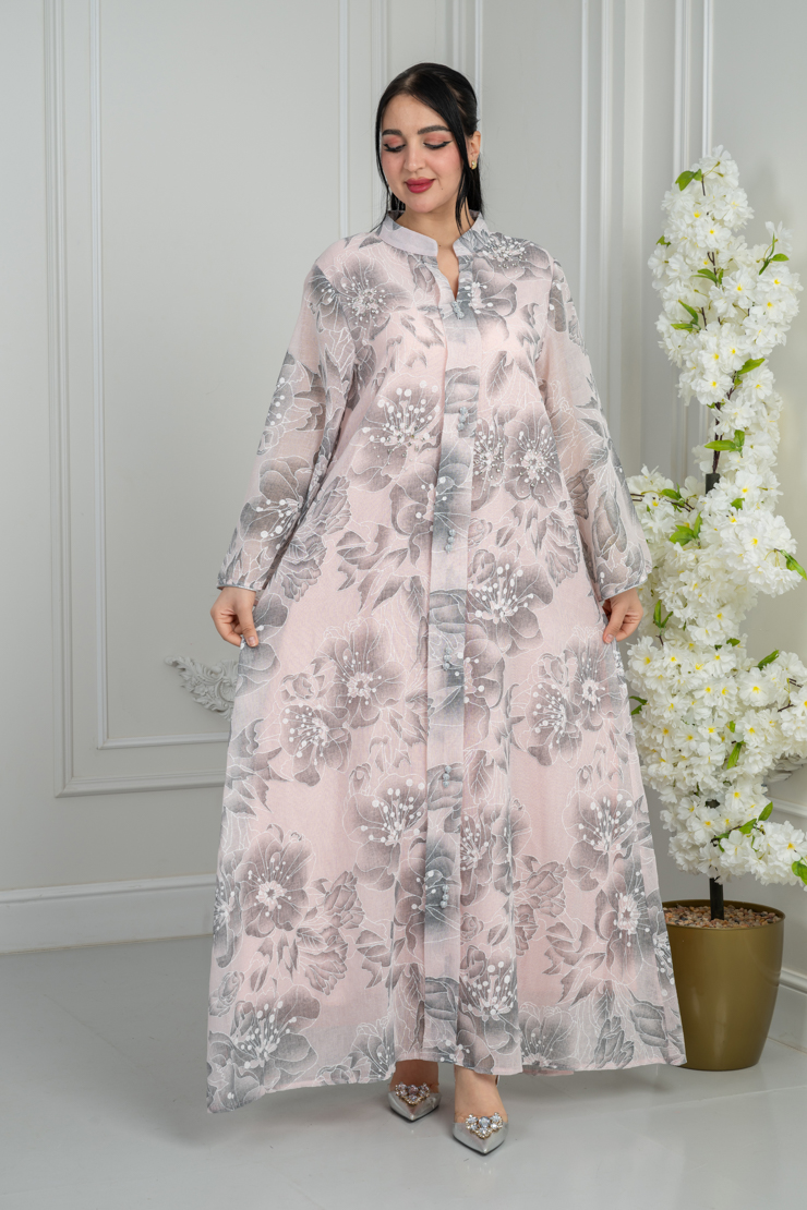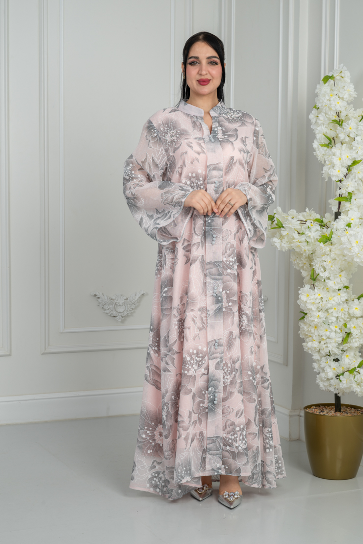 جلابية بلون وردي فاتح مع نقشة فنية أنيقة لإطلالة ناعمة ومميزة.