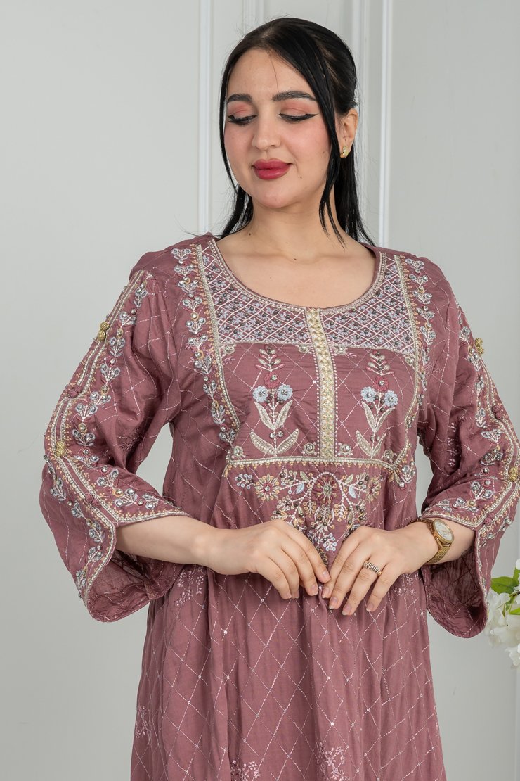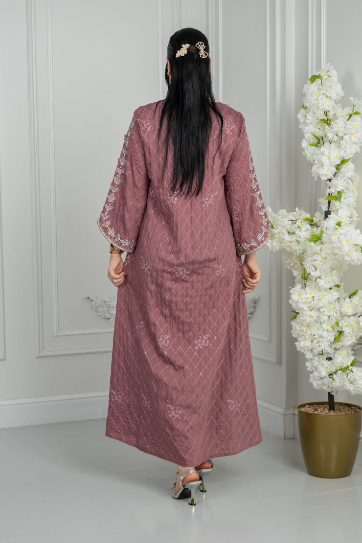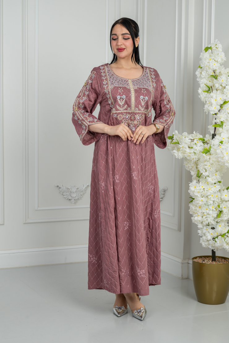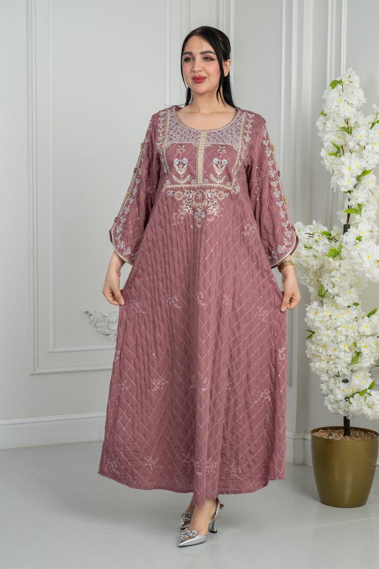 جلابية بتصميم أنيق وقصة مريحة، بلون وردي غامق يمنح حضورًا لافتًا، مع تطريز غني على الصدر والأكمام يبرز جمال القطعة دون مبالغة. مناسبة للمناسبات والزيارات.