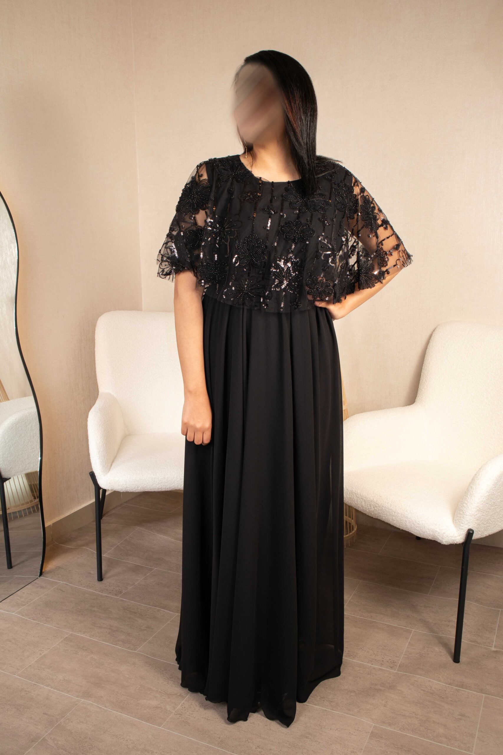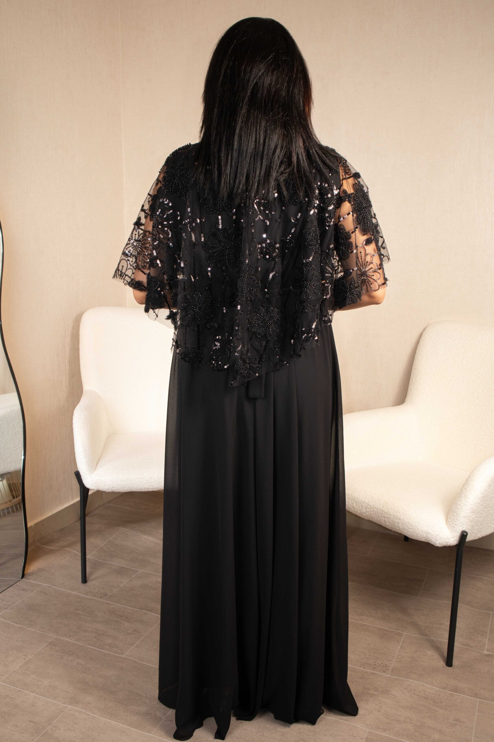 فستان سهرة أسود طويل بتفاصيل خرز أنيقة وقصّة راقية.