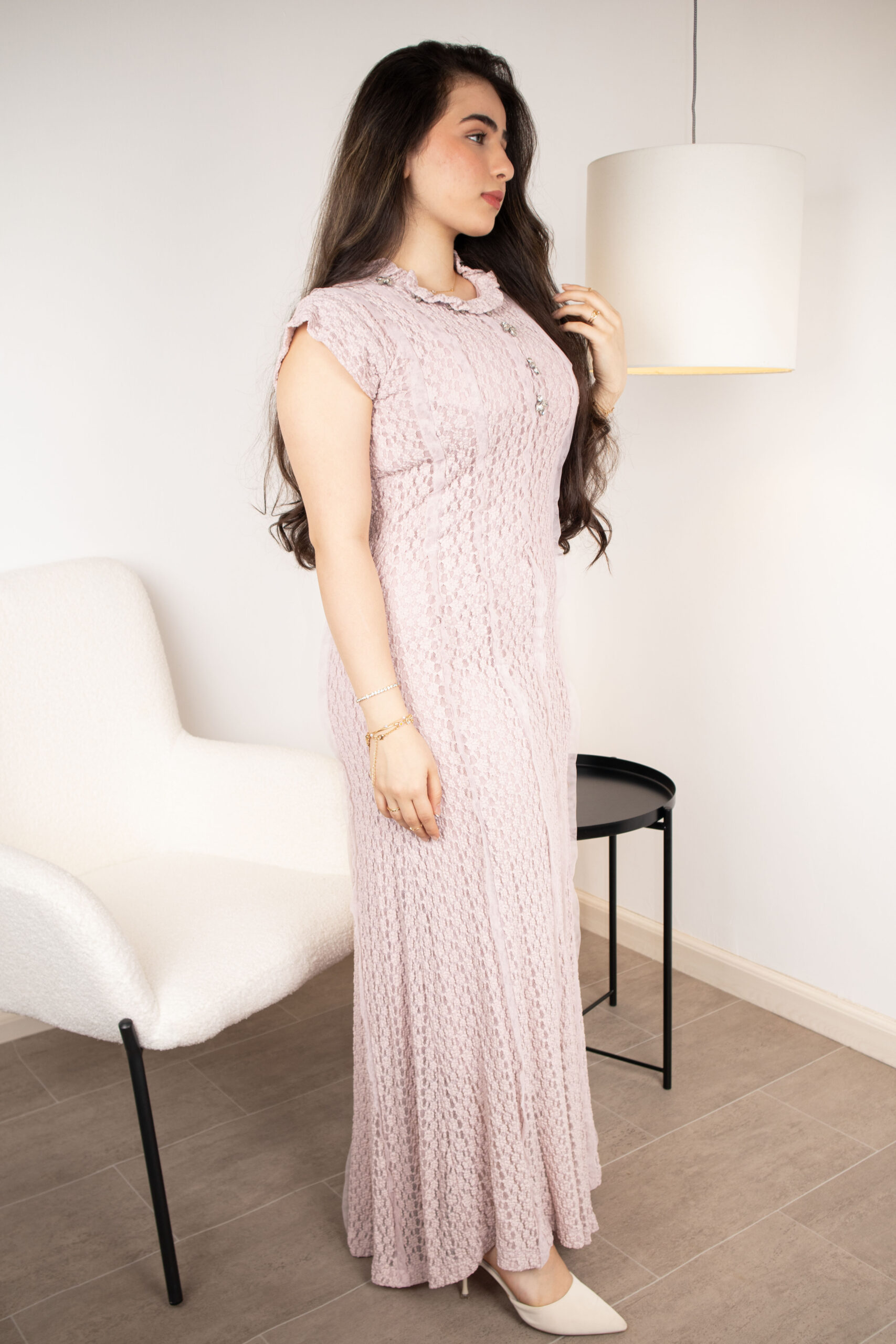 يجسد هذا الفستان الأنوثة الطاغية بلونه الوردي البودر وتصميمه الراقي. يتميز بتوزيع فني لقطع الكريستال البارزة على شكل زهور متناثرة على الخصر والصدر، مما يعطي إيحاءً بالفخامة والتميز.