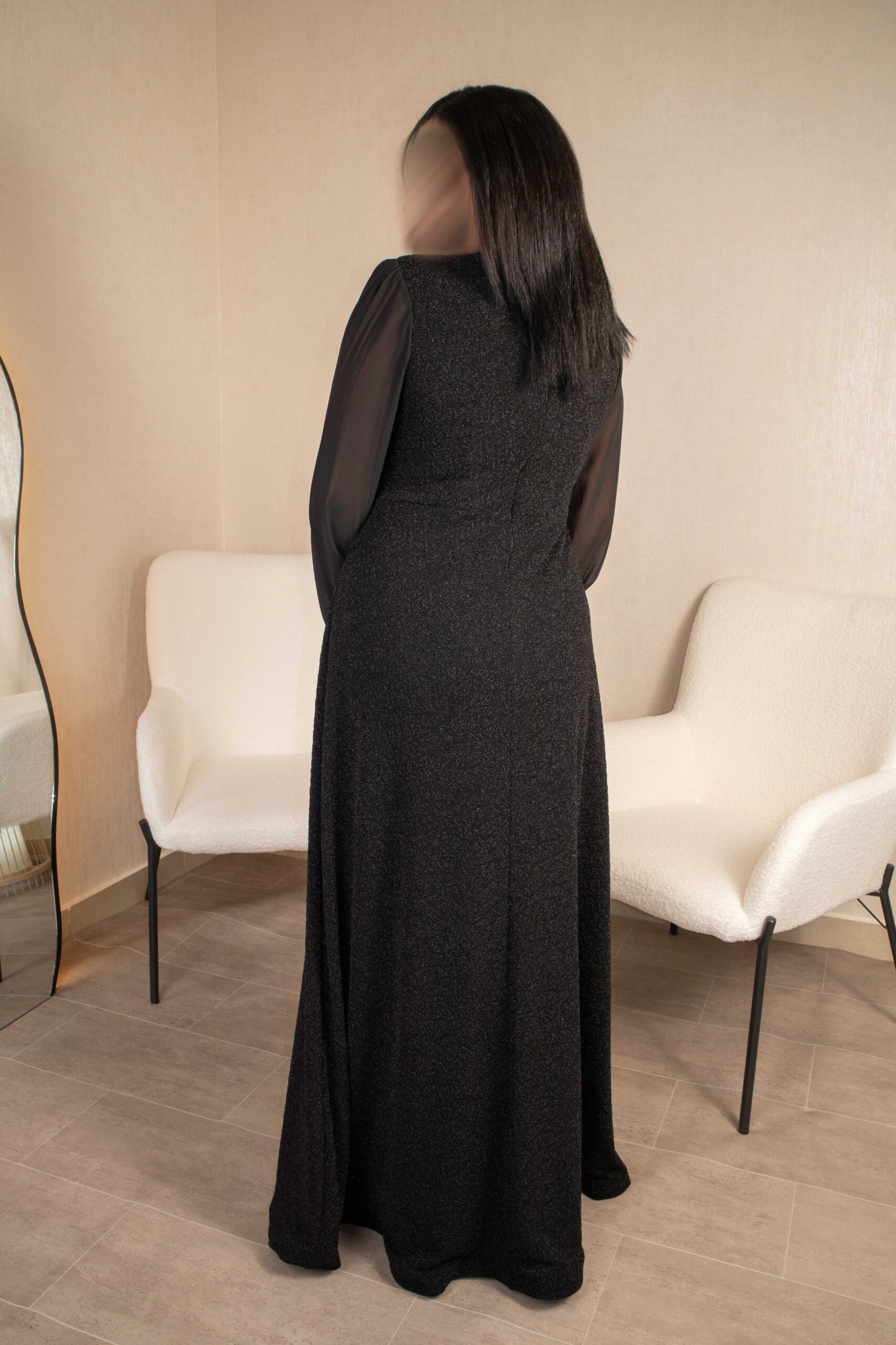فستان سهرة أسود طويل بأكمام شفافة وقصّة أنيقة من خامة أسترتش.