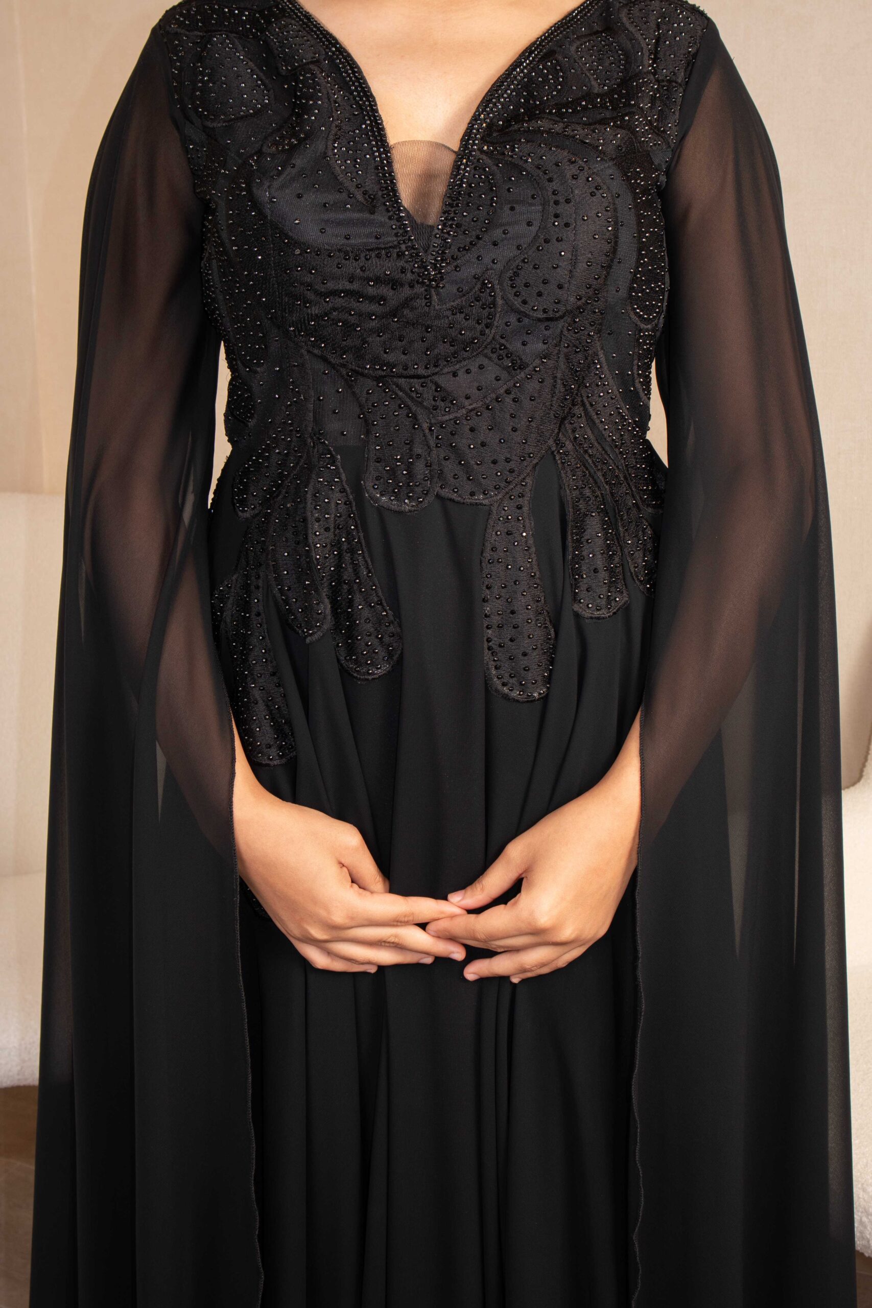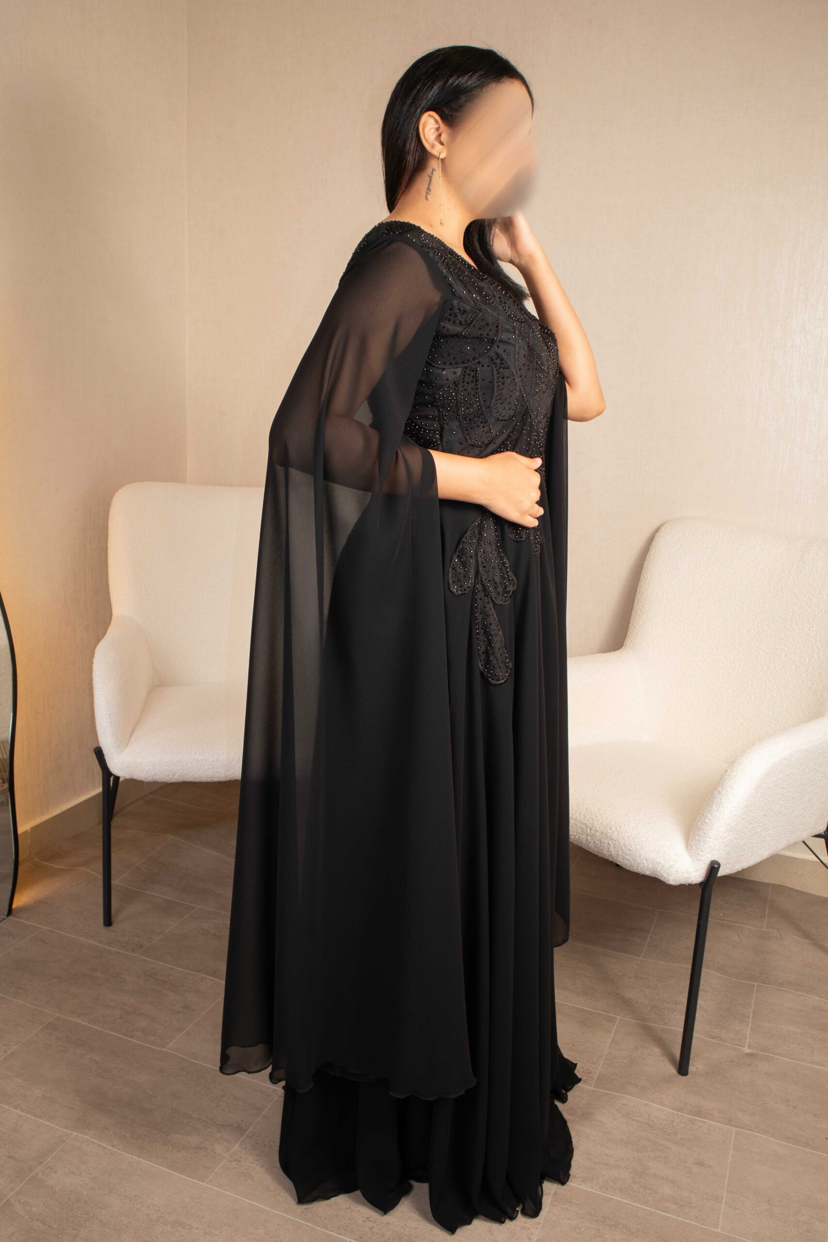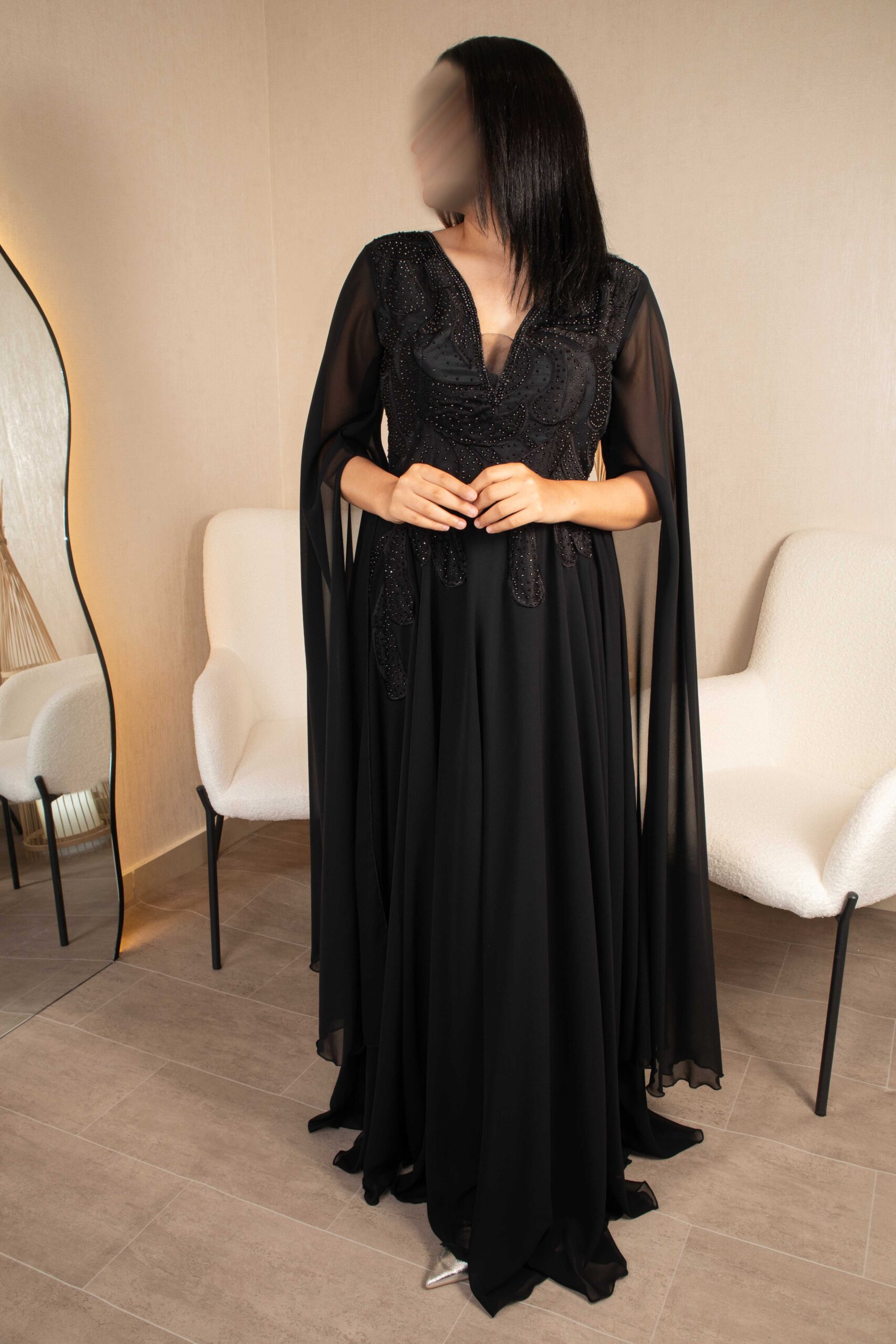 فستان سهرة أسود طويل بتطريز دقيق ولمسة أنثوية راقية.
