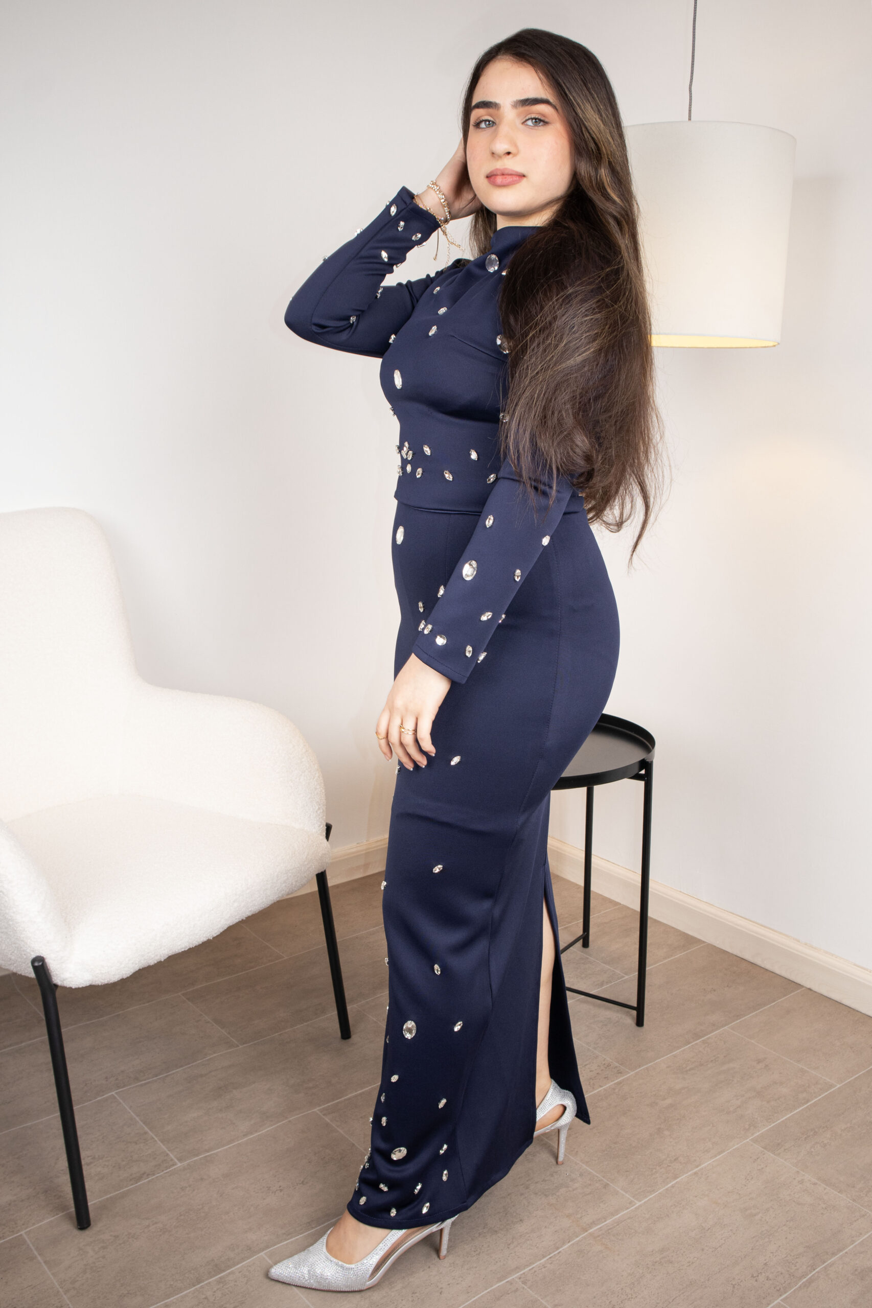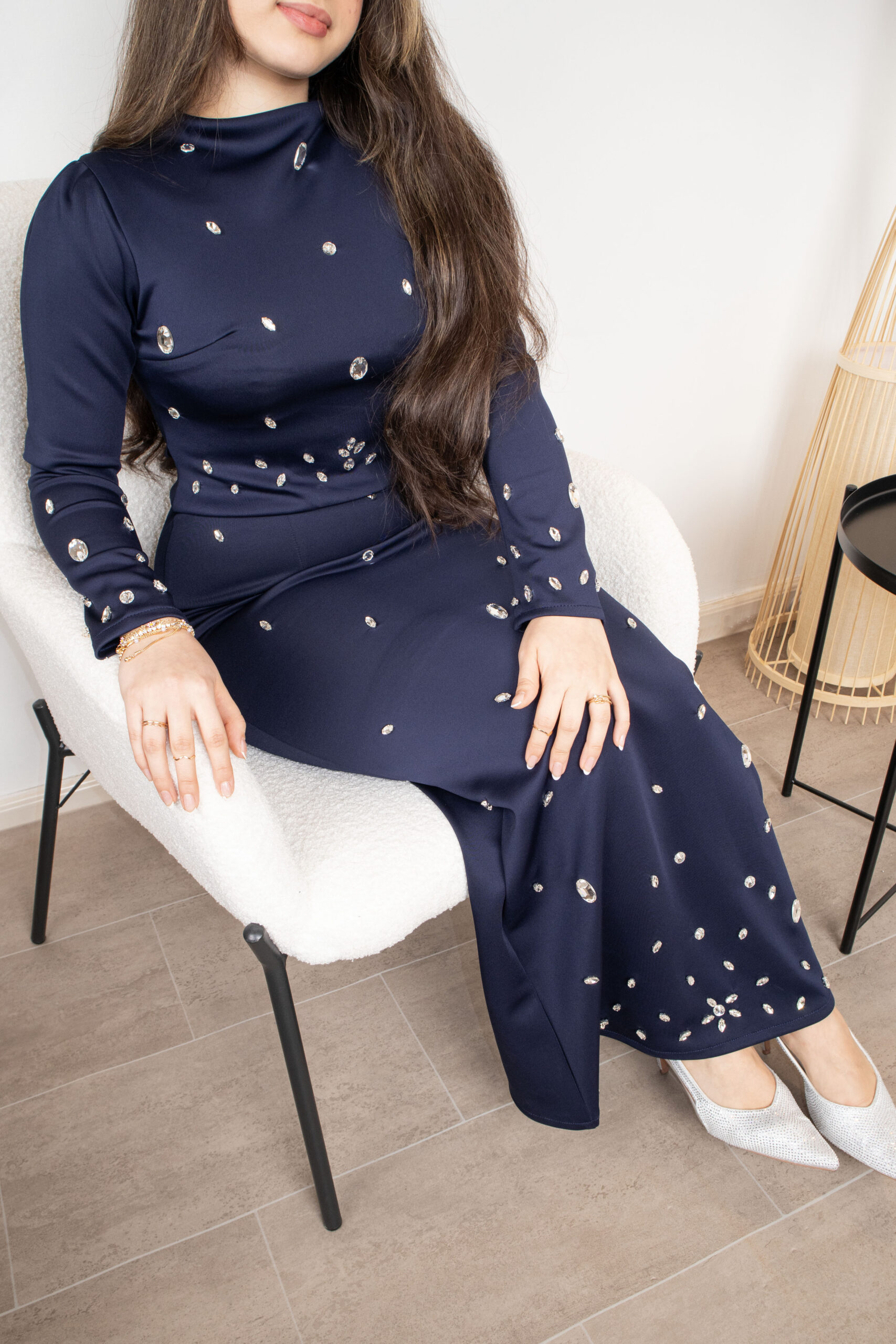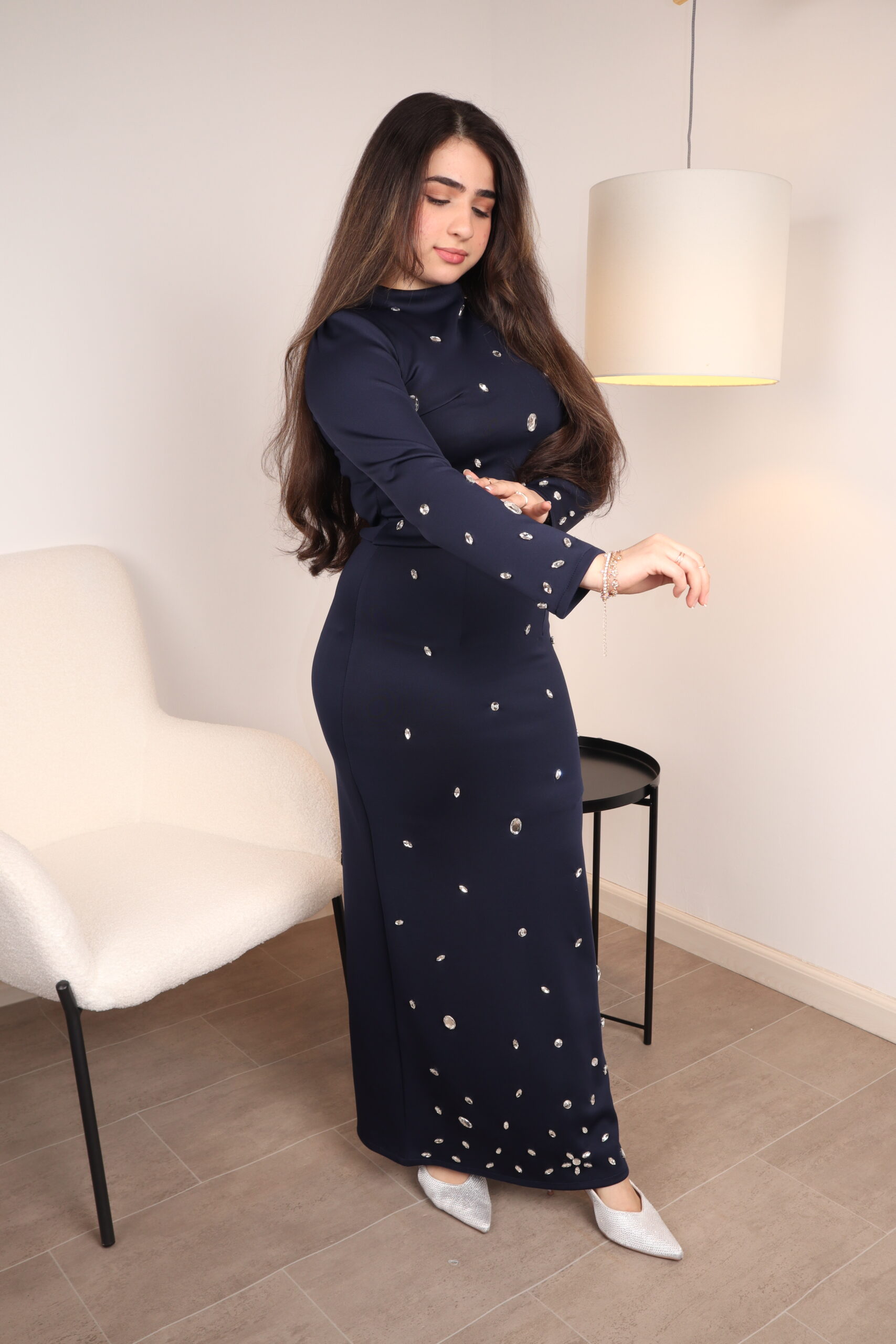 لإطلالة ملكية غامضة، يأتي هذا الفستان بلونه الكحلي العميق ومرصع بالكامل بآلاف الأحجار الصغيرة التي تعكس الضوء مع كل حركة. التصميم يتميز بياقة مرتفعة وأكمام طويلة، مما يجعله الخيار الأول للمناسبات الرسمية الفخمة.