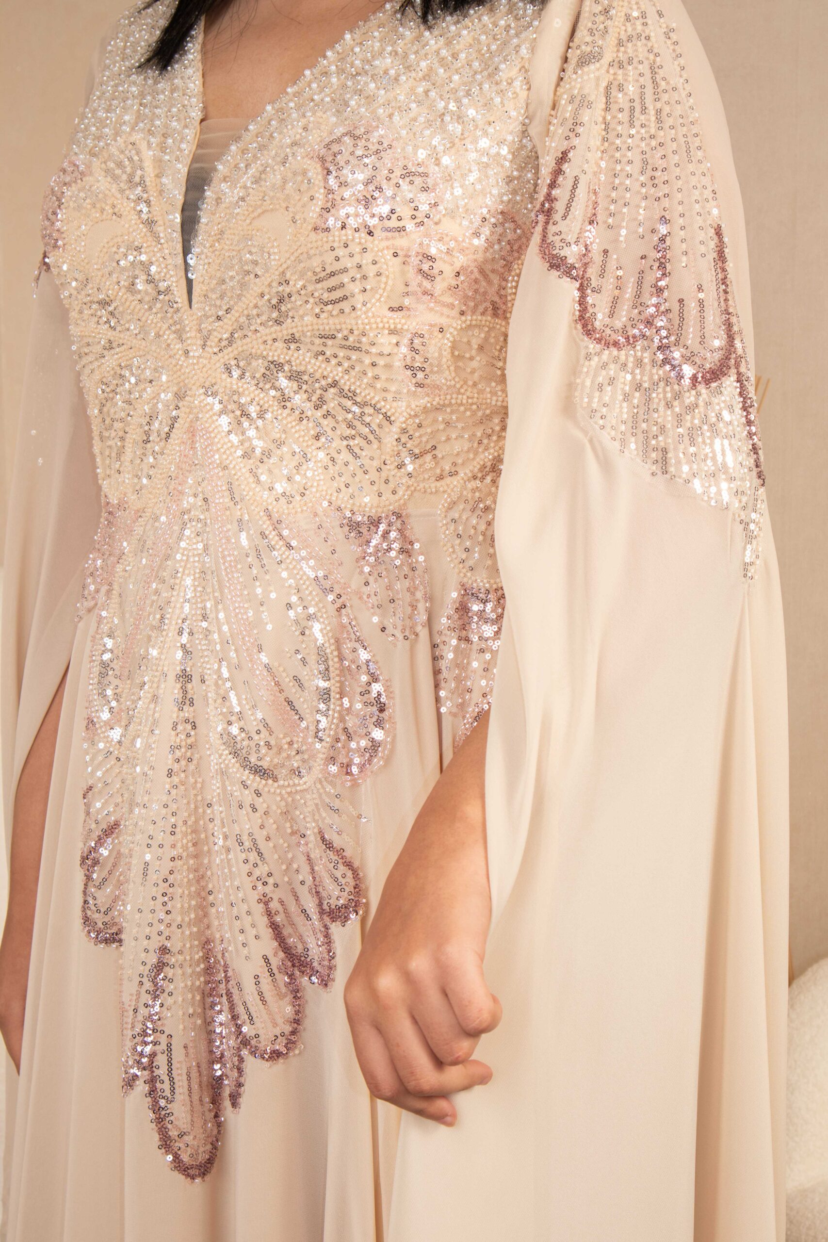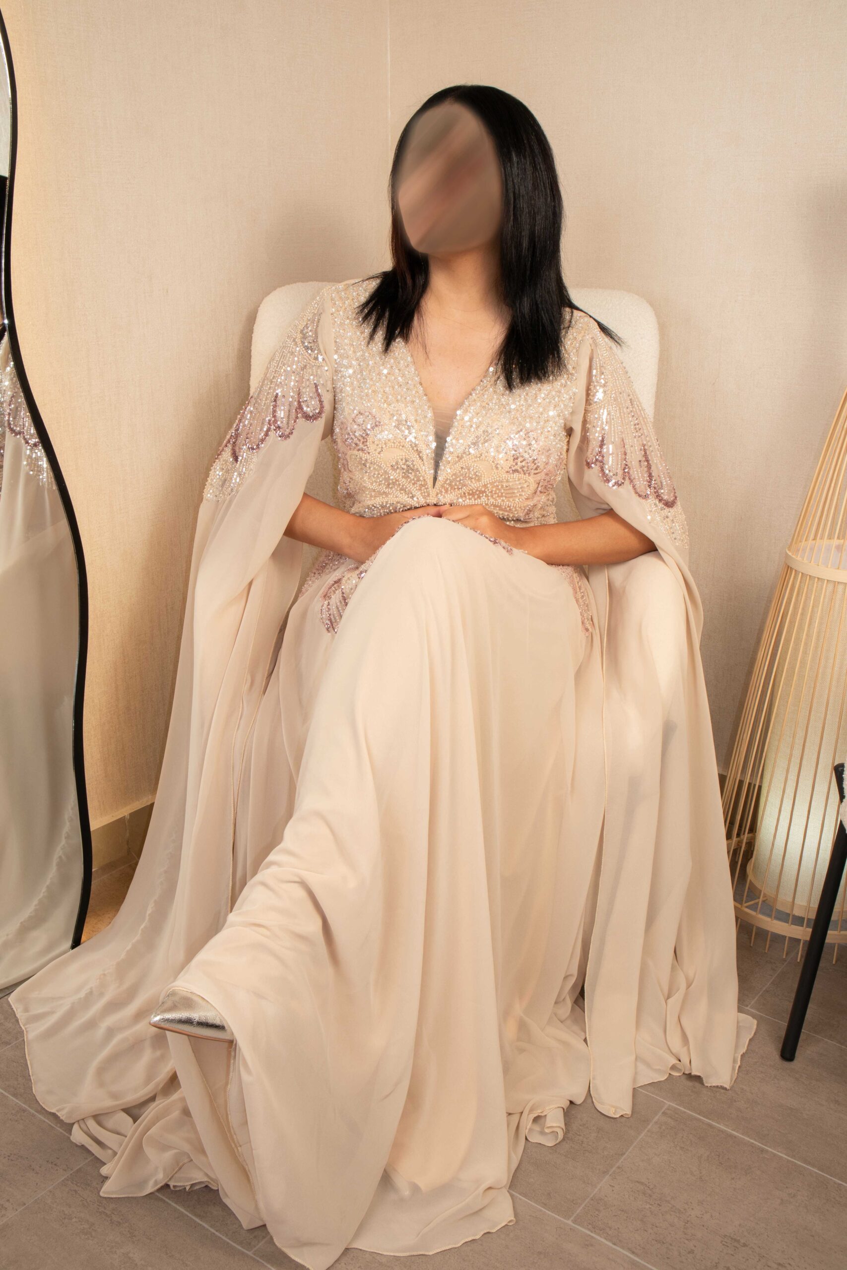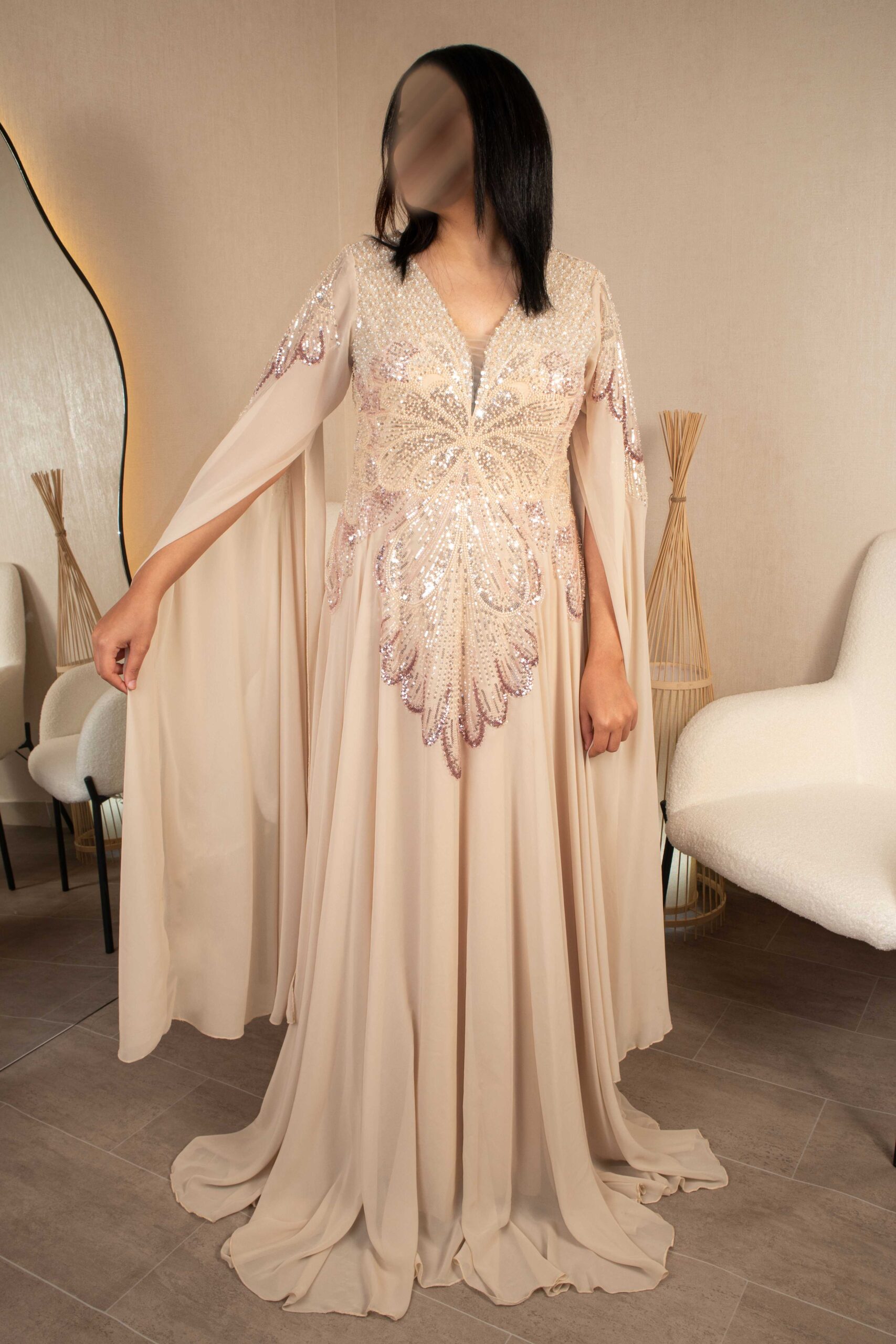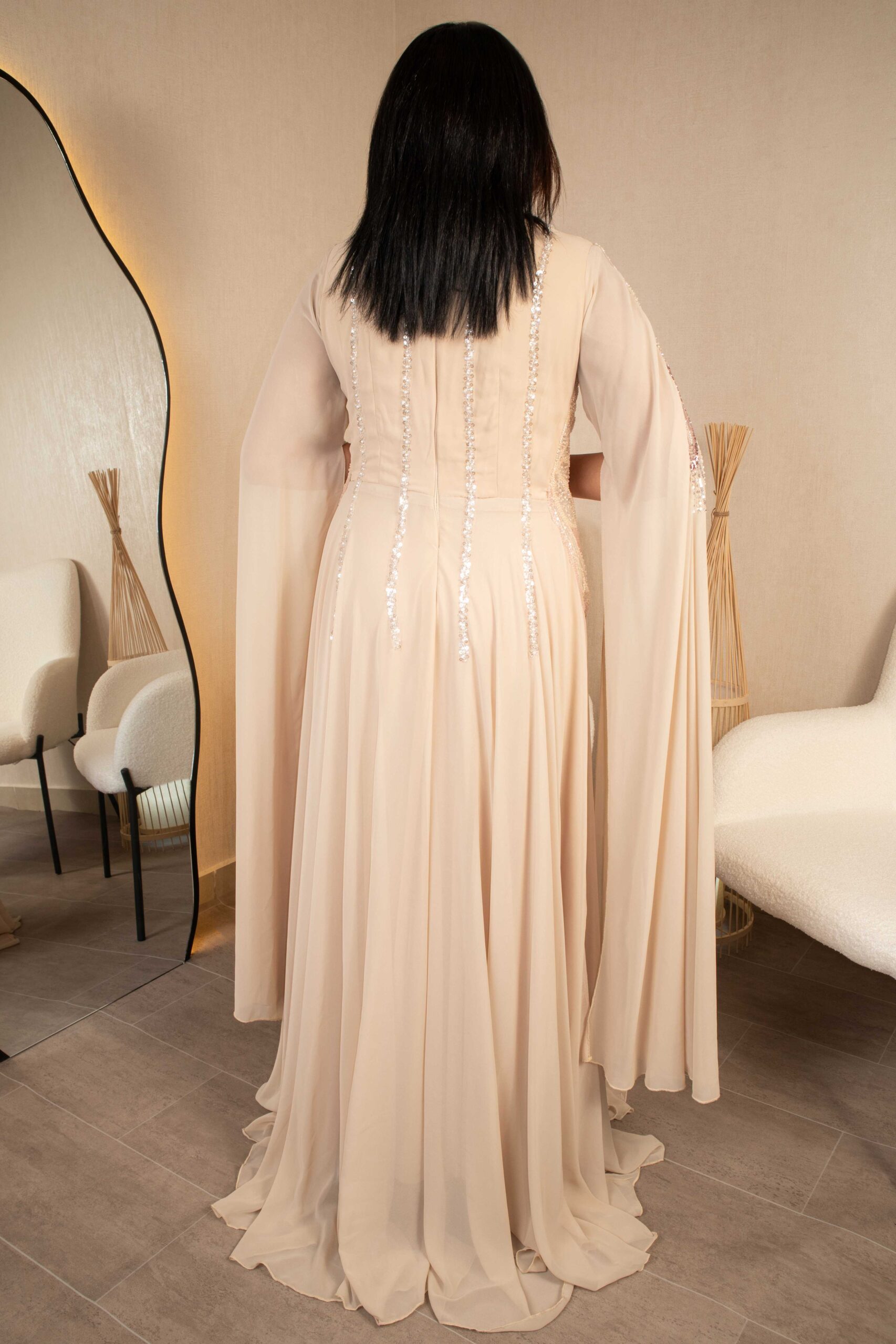 فستان سهرة طويل بلون بيج فاتح مع تطريز ناعم وقصّة راقية.