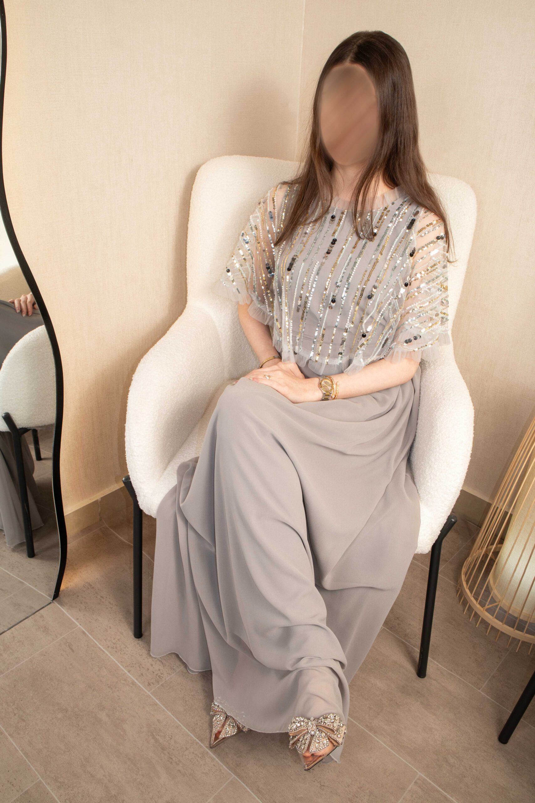 فستان سهرة ناعم بلون رمادي فاتح مع زخرفة أنيقة ولمسة فخامة هادئة.