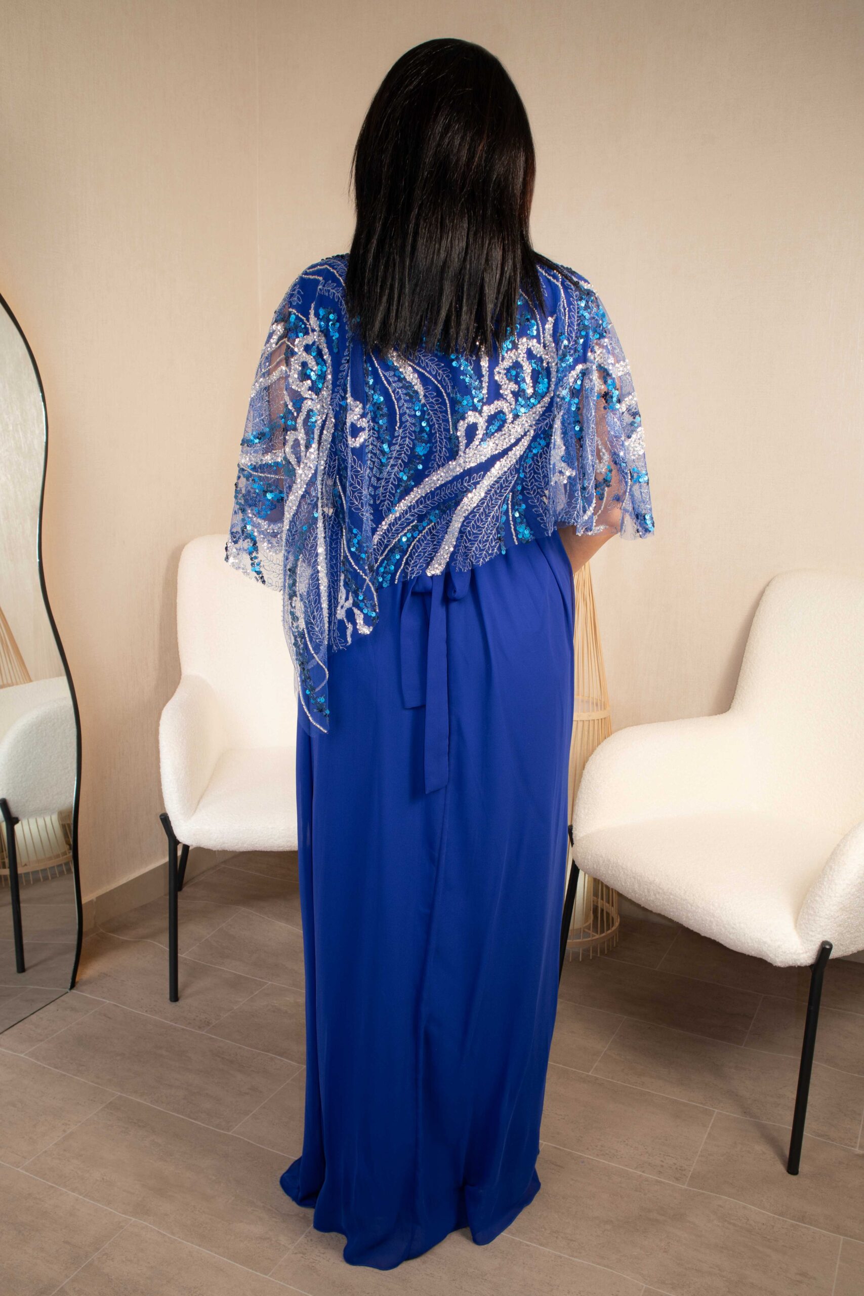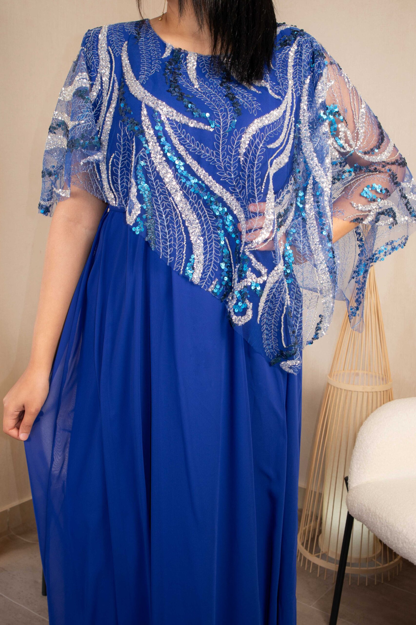 فستان سهرة ناعم باللون الأزرق الملكي مع زخرفة أنيقة ولمسة فخامة.