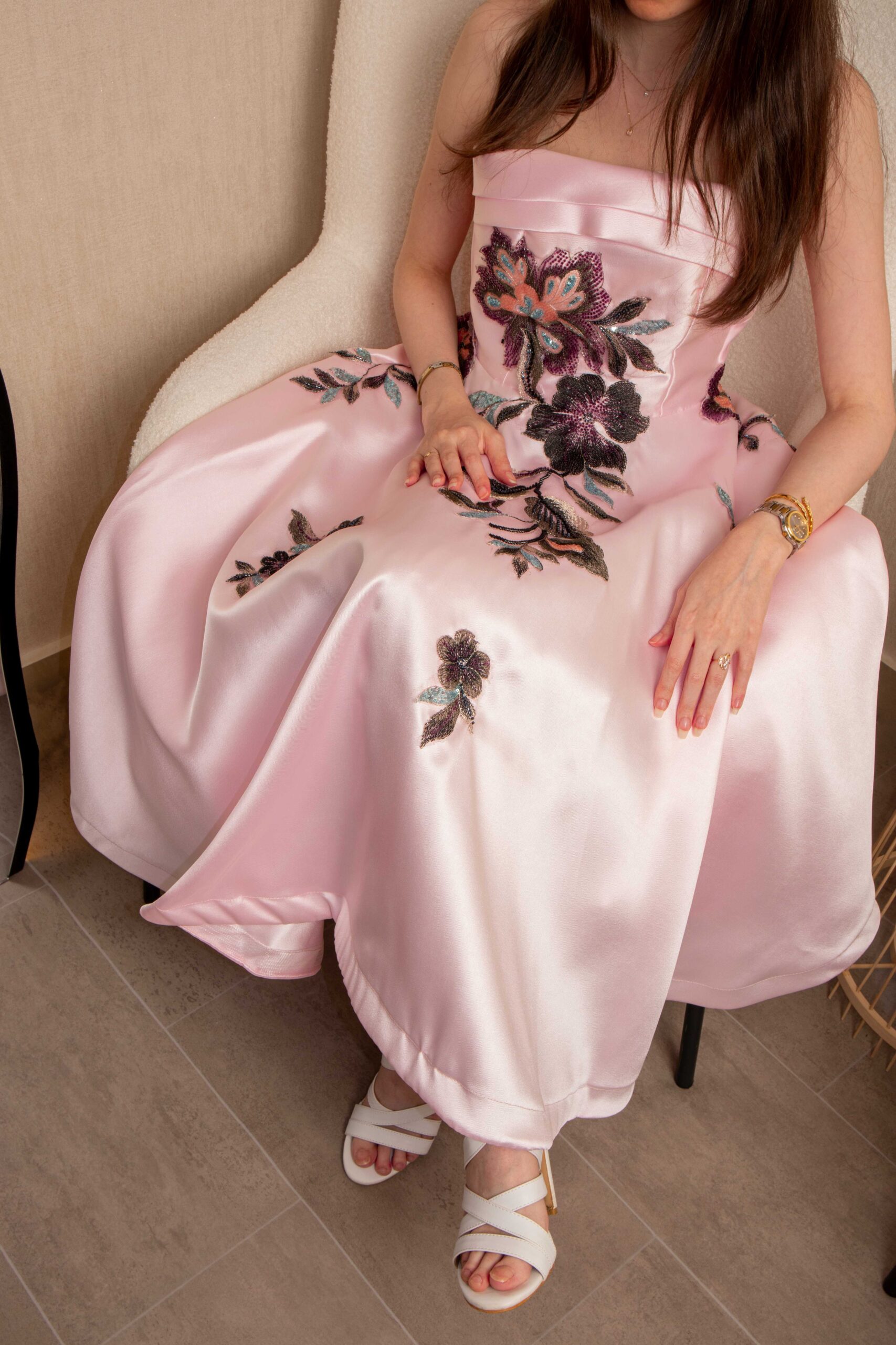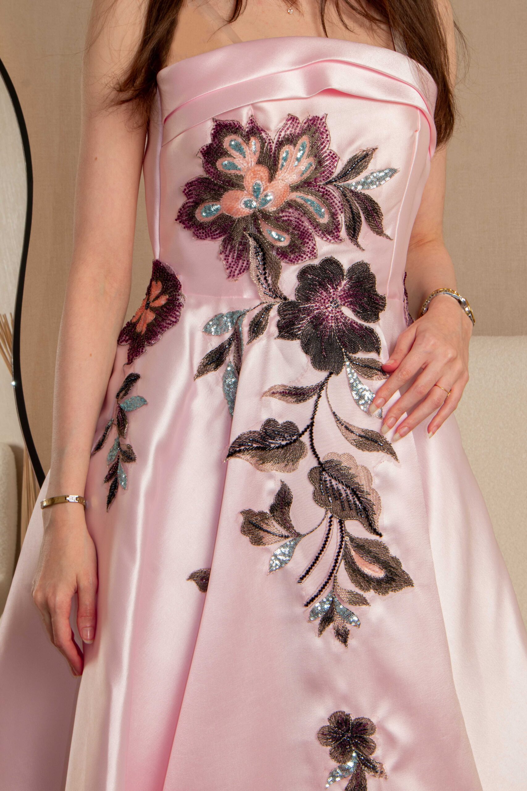 فستان سهرة أنيق من مس لورين بتصميم ناعم يجمع بين الرقي والبساطة، مناسب للمناسبات الخاصة والسهرات. يتميز بلونه الوردي الفاتح المائل للشمبانيا مع تطريز أسود يضفي لمسة فخامة جذابة، وقصّة قصيرة تمنحك إطلالة عصرية ومريحة في نفس الوقت.