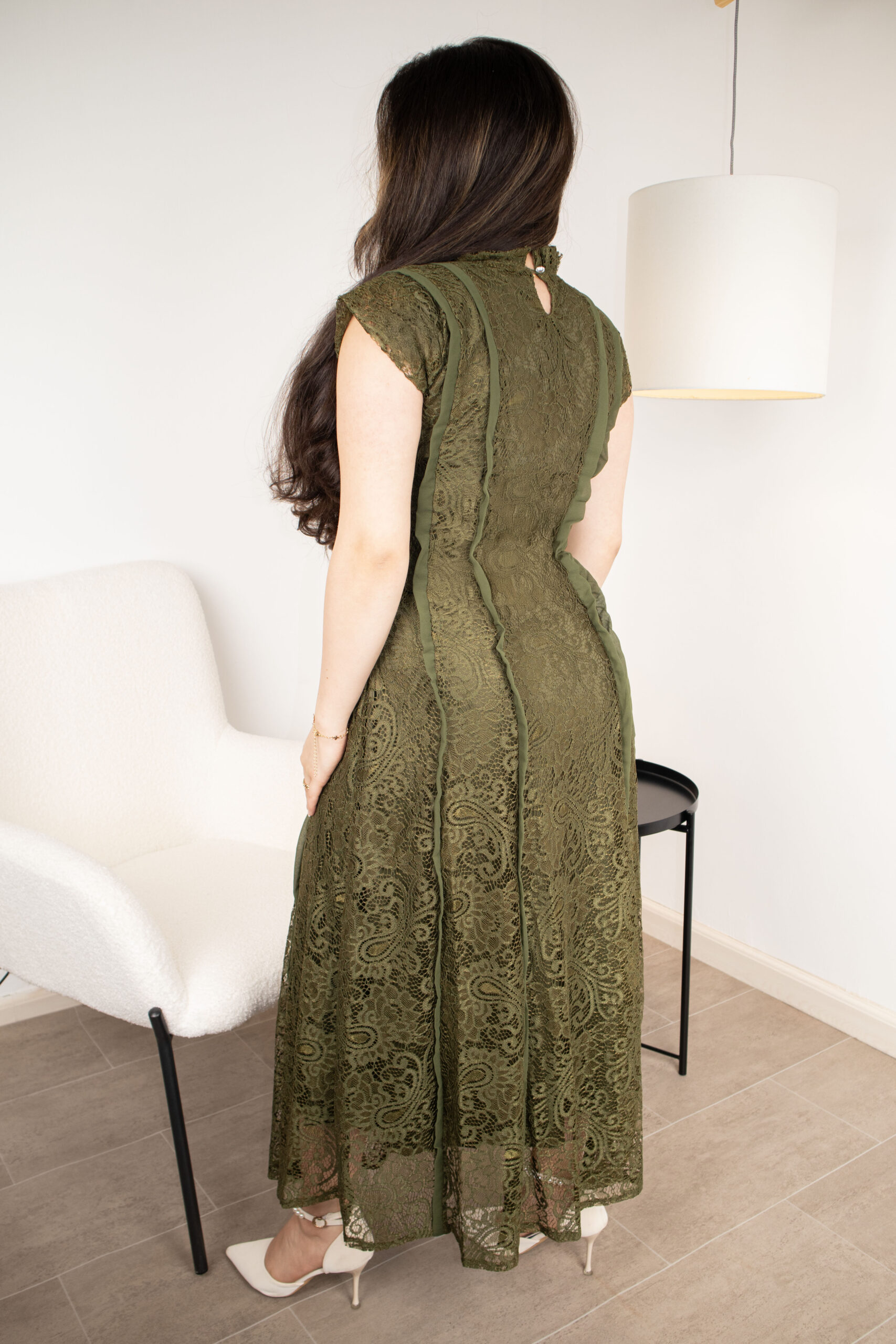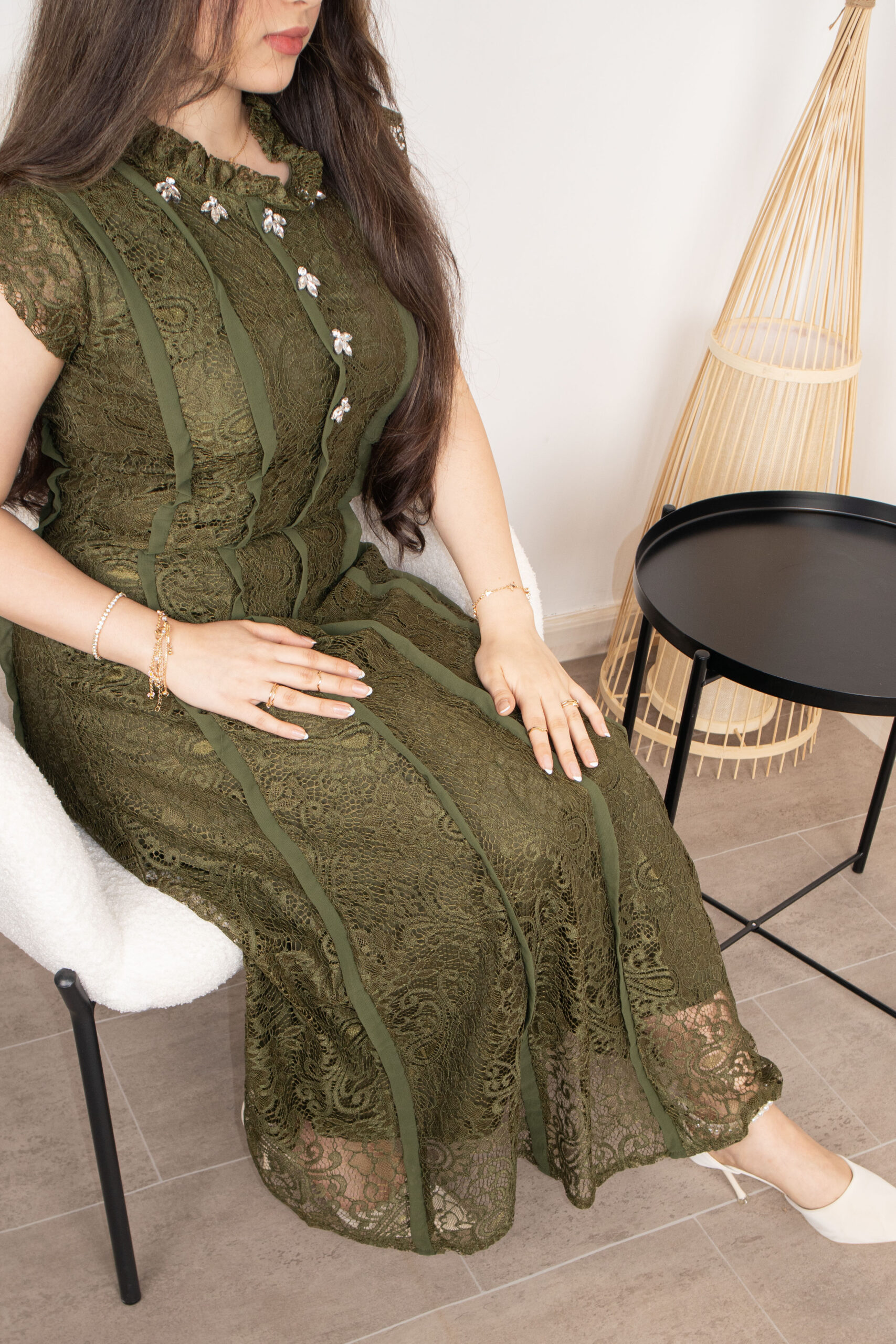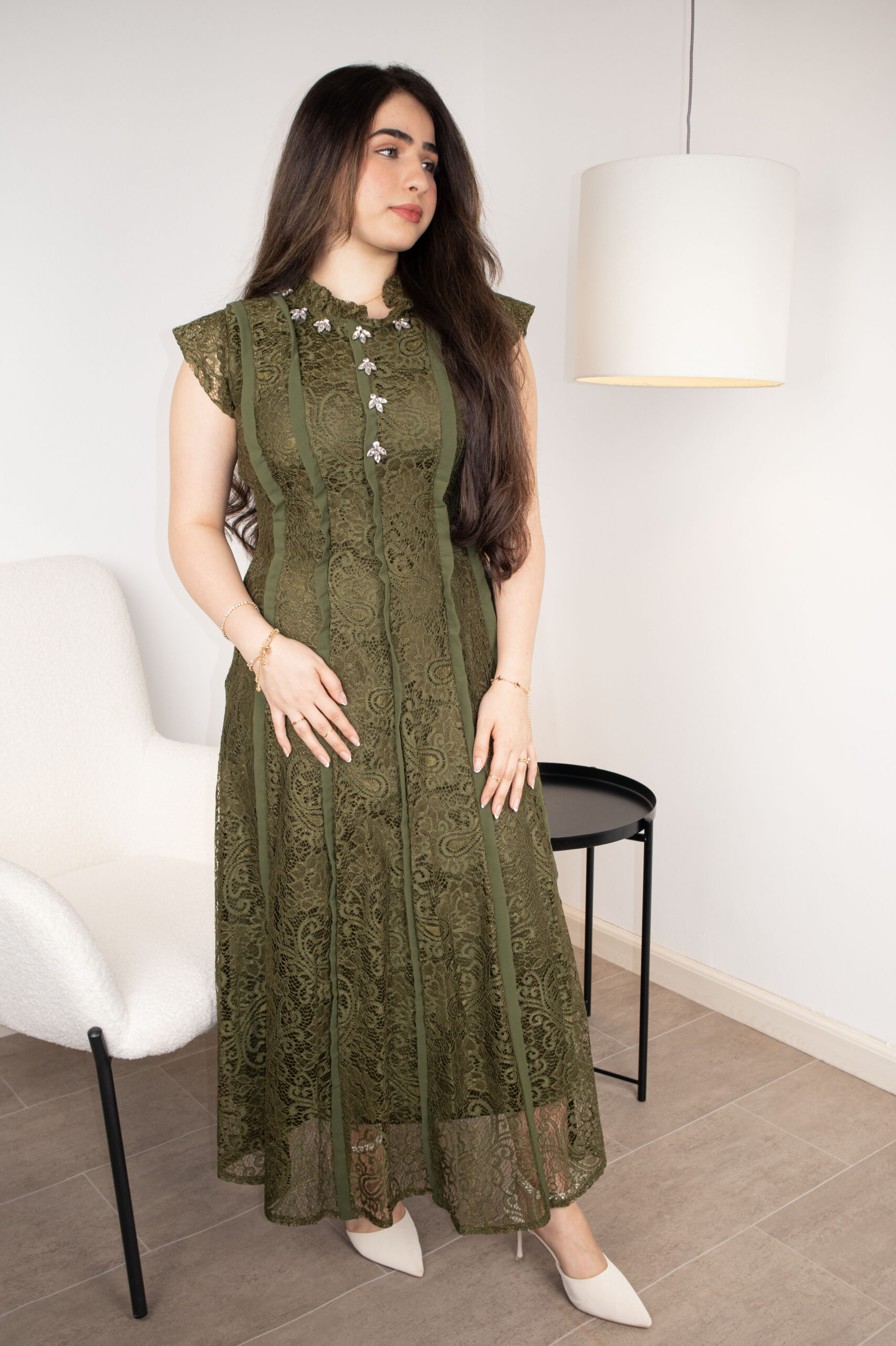 فستان ميدي فاخر مصنوع من الدانتيل المشغول بتفاصيل فنية دقيقة، يتميز بياقة عالية بنمط الكشكش وتزيينات صدر براقة. تصميم يجمع بين الأناقة الكلاسيكية والقصة العصرية، متاح باللونين الزيتي الملكي والأسود الفخم لجميع مناسباتك الراقية.