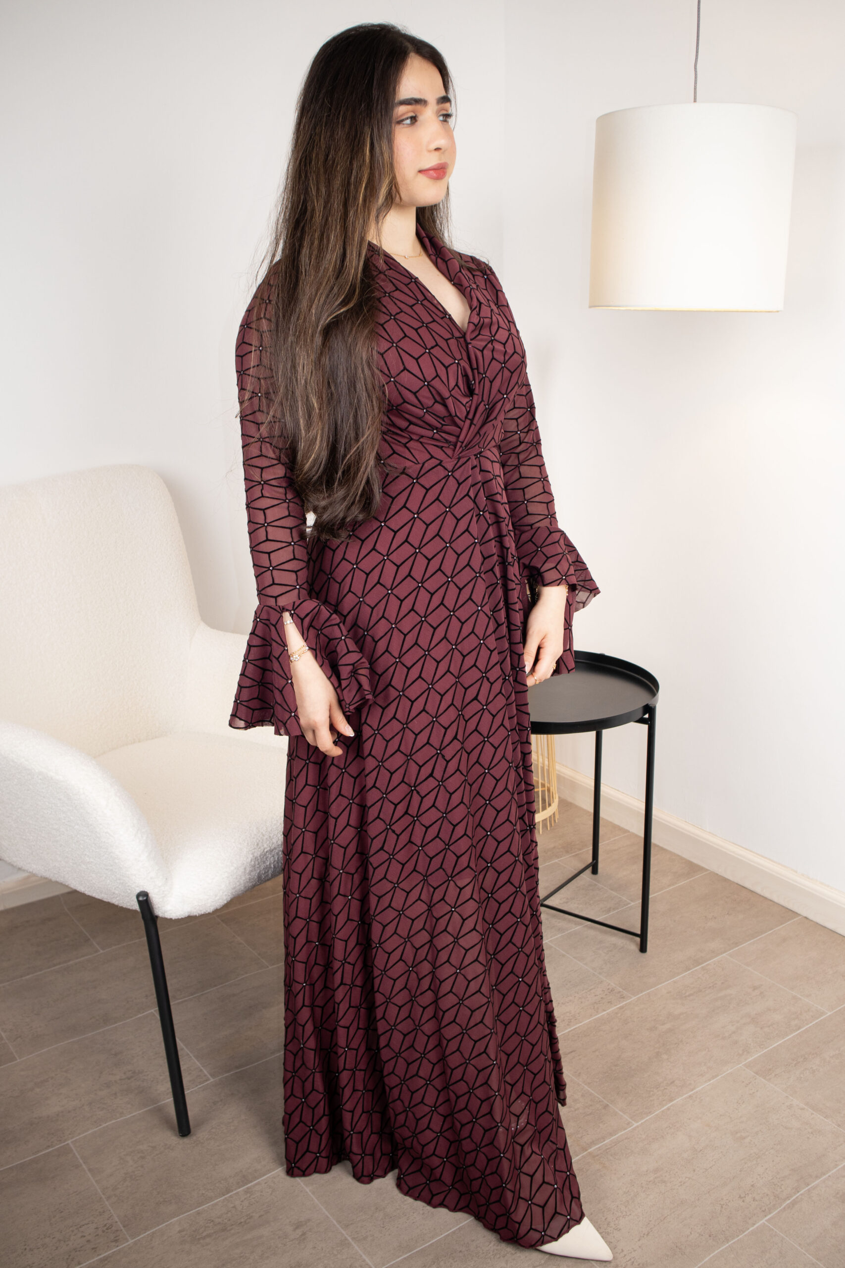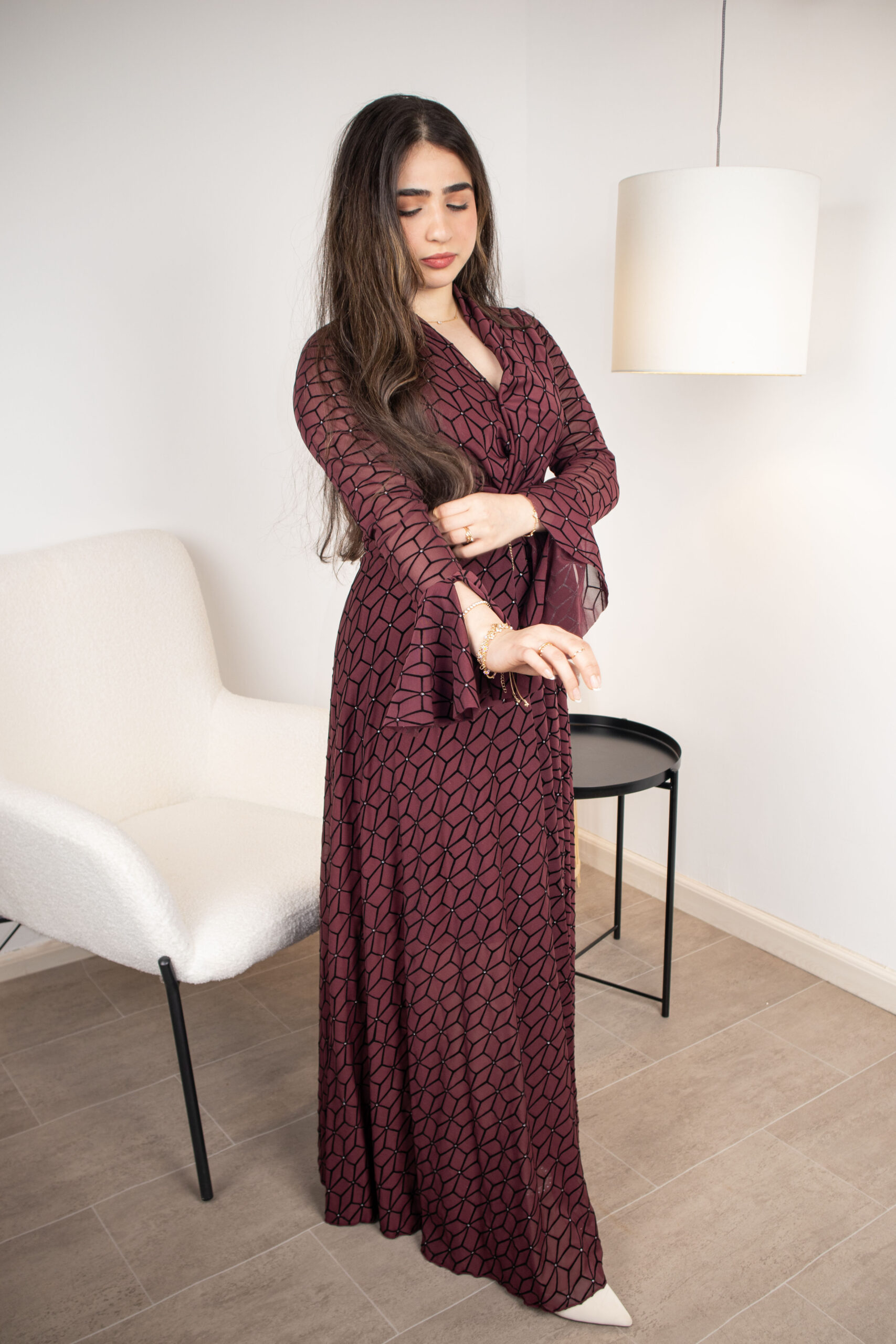 فستان عنابي فاخر بنقوش هندسية دقيقة يتخللها بريق ناعم من الكريستال، مثالي لسهرات العشاء والمناسبات الراقية.