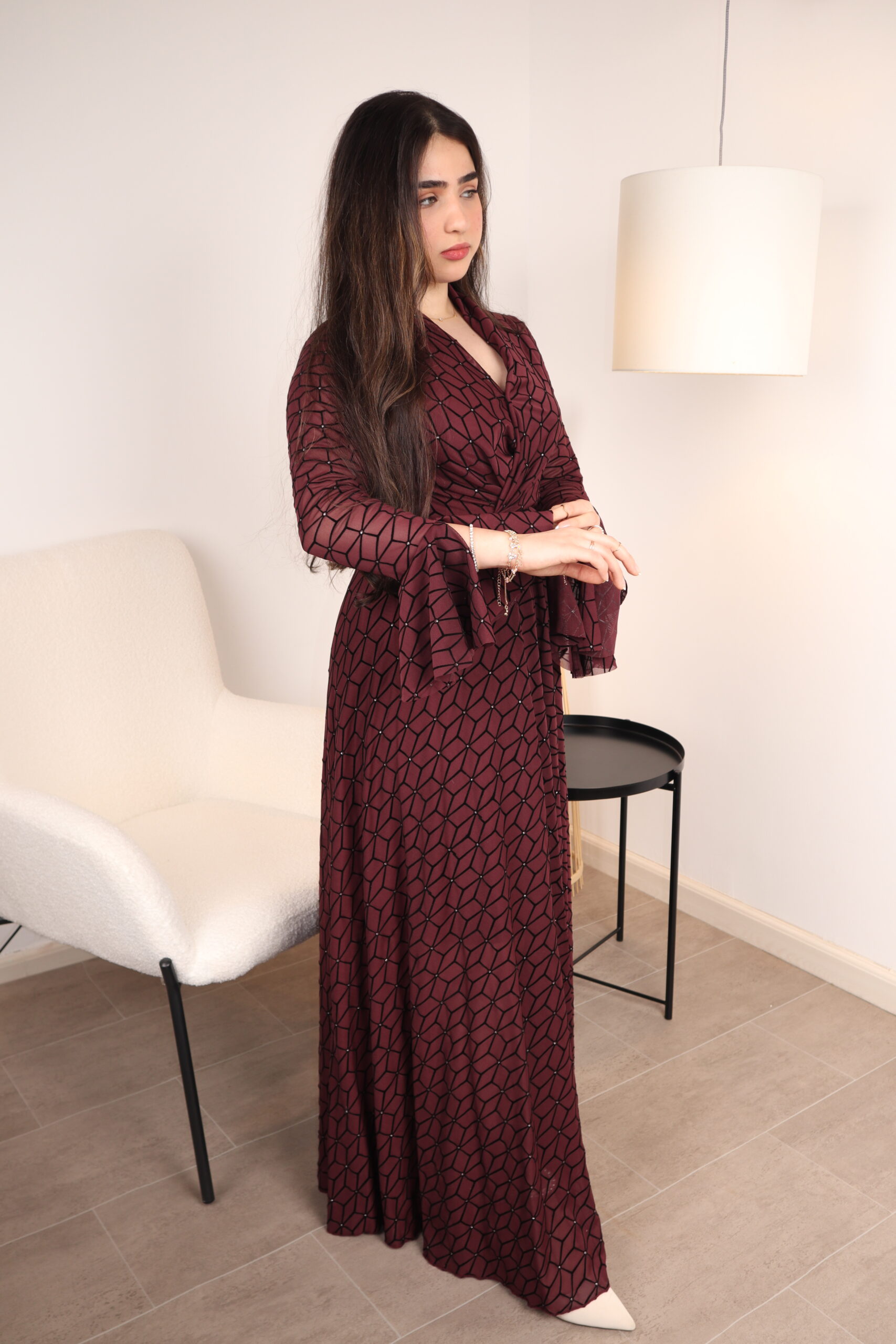 خوضي تجربة الأناقة العصرية مع فستان “ماربيلا” المميز بلونه العنابي الدافئ (Burgundy). ما يميز هذه القطعة هو القماش المزين بنقوش هندسية دقيقة ومنتظمة، يتخللها بريق ناعم من حبيبات الكريستال أو الخرز الصغير الموزع بعناية، مما يجعله قطعة مثالية لسهرات العشاء والمناسبات الراقية التي تتطلب إطلالة هادئة ومبهرة في آن واحد.